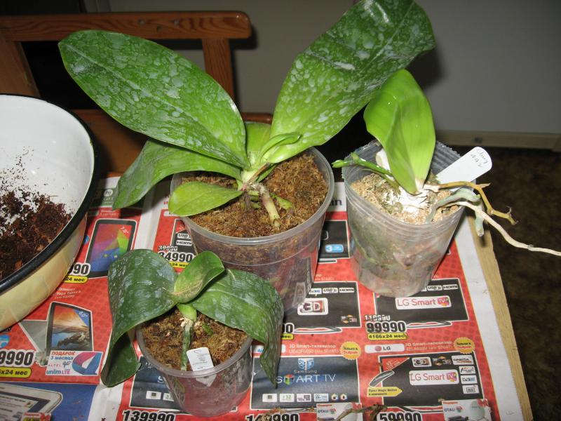 И мой отчет по заказу, заказывала P.violacea red x sib, пришла замечательная коняжка, отличное большое растение, есть два пенька от цветоносов, уже пересадила, корней полный горшок! К сожалению, вторая виолацея ред плохо перенесла дорогу, несмотря на старания нуни-Надежды, обработка корицей и зеленкой не помогла, отвалились все листья, кроме центрального, очень жаль! изначально было шикарное растение с двумя цветоносами!!! Один цветонос засох, второй еще живой, обработала фундазолом, надеюсь, что точка роста жива и растение оклемается, пока не пересаживала орху, будем наблюдать. И заказывала еще P.gigantea x violacea blue, пришел подросток, еще не цвел, всего два листа, третий только начал расти, тургора нет, листья как тряпочки, при пересадке обнаружила, что внутри все корни сгнили, остались только те,что успели сверху мха нарасти, но ничего страшного, корни нарастим,тургор восстановим.