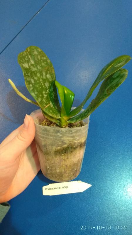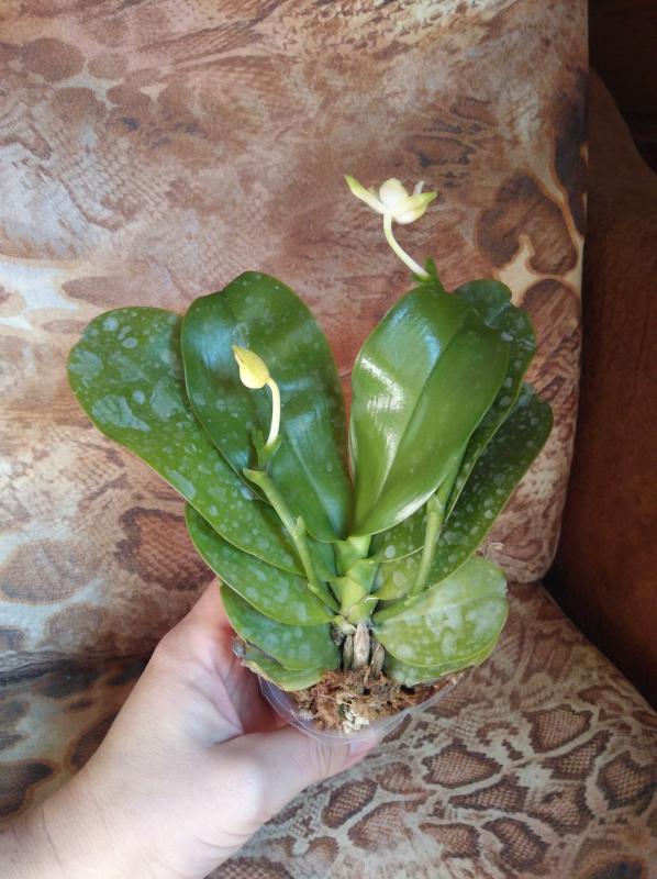 Листья большие от 14см до 18см, 4 штуки, в хорошем тургоре. Мох хорошо просушен. Цветонос толстенький 9см. Имеется бирка с номером заказа из каталога и кодом.