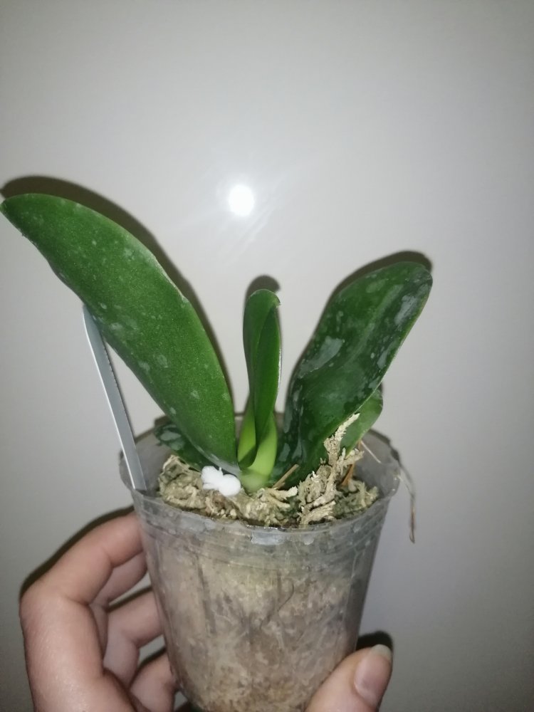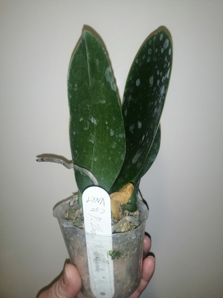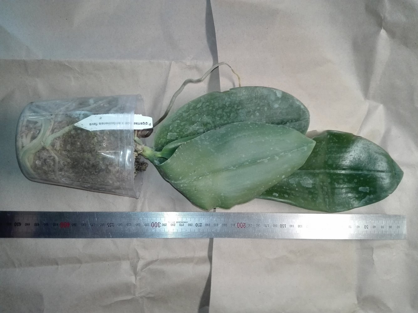 Размер 3,5! Огромная! 3 широкие листа: 20, 20 и 30 см! Тургор незначительно снижен. Мох сухой. Корни чуть высохли, но отопьются. Замят и сломан край у большого листа при упаковке. В остальном прекрасная орхидея за такую небольшую цену. Спасибо Пассифлора.