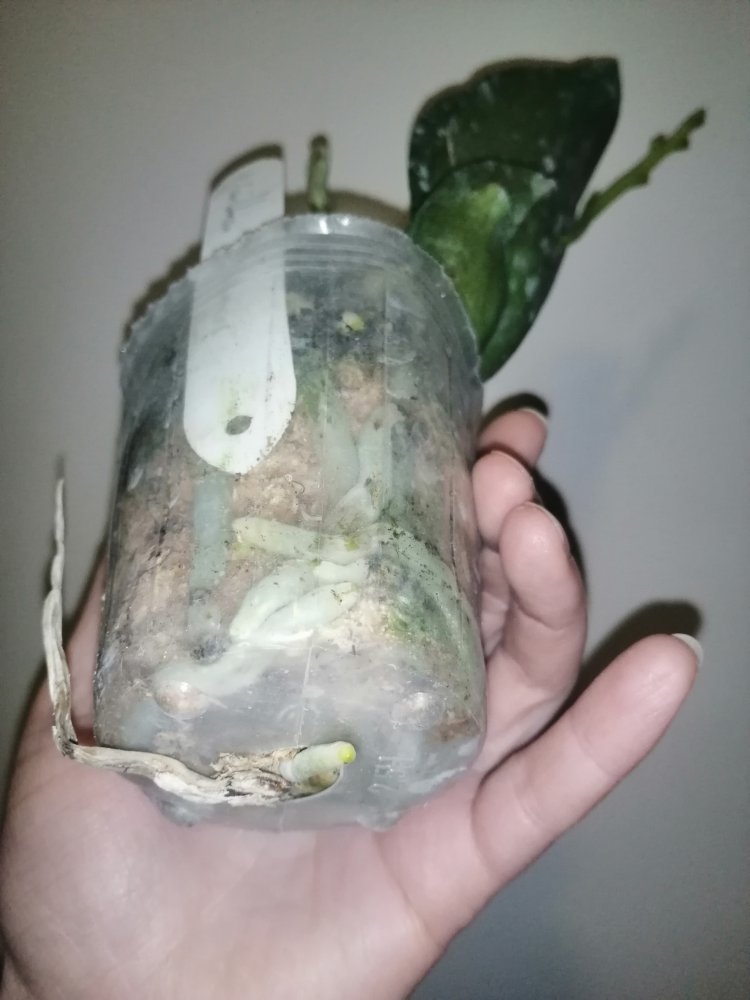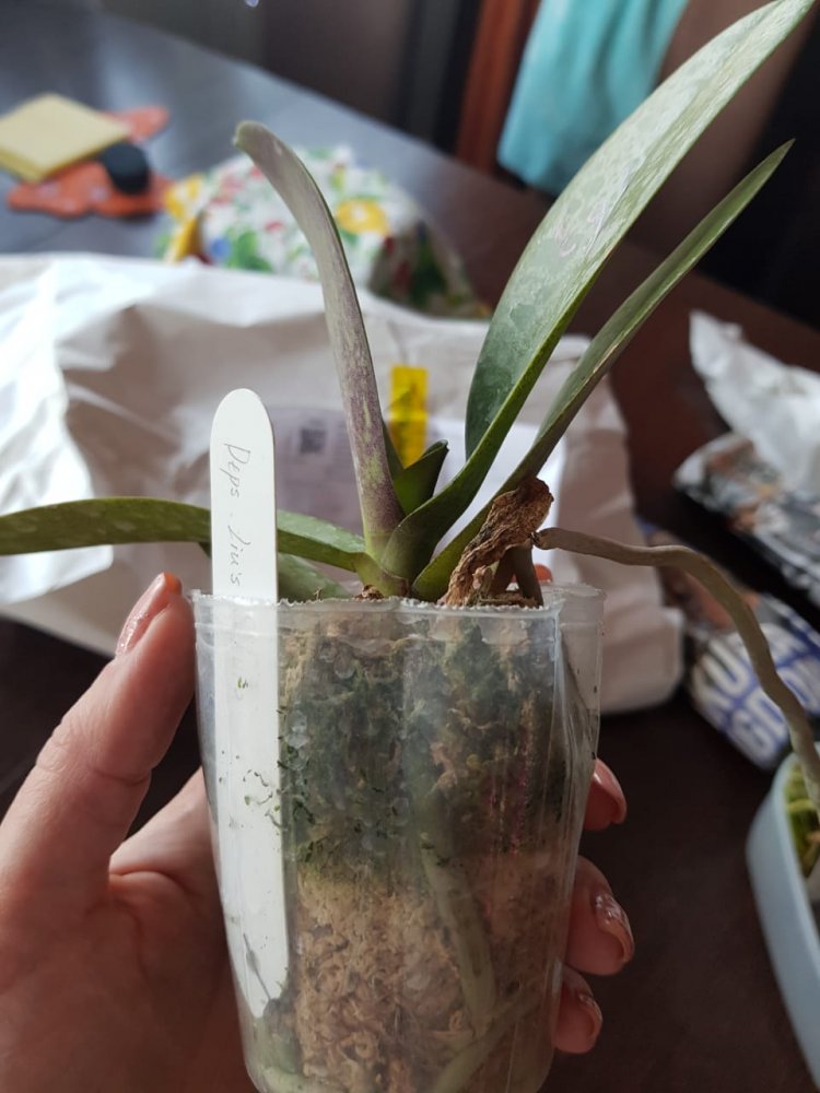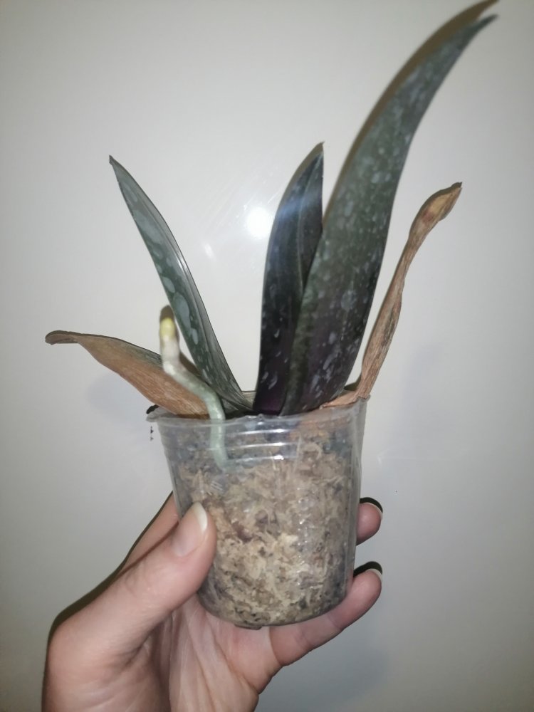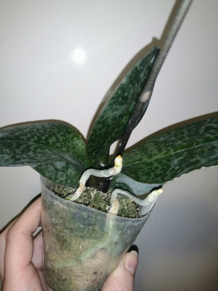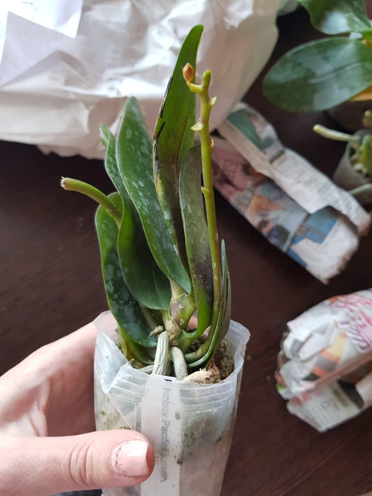 Пришло два взрослых растения в горшках 2,5. Phal. Fangmei Rainbow в более хорошем состоянии, с цветоносом, даже есть живые бутоны, также имеется след от предыдущего цветоноса. Корней много, часть в горшке, часть воздушные, есть живые. Phal. Princess Sakura такое впечатление, что побывала в серьезной передряге и очень-очень давно сухая. Пересушенная, мятая, прямо пожеванная с засушенным в сухарь листом и 5 давно высохшими цветоносами. Много воздушных неживых корней. И при этом!!!!! Есть живые в тургоре корни и явное желание жить. Это потрясающе!😳😱🤩 Буду потихоньку отпаивать.