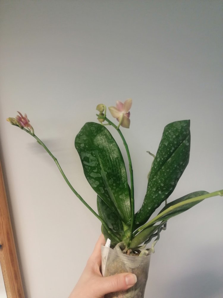 Phal.Jaiho's Pink Girl X mannii black пришел с двумя отцветшими цветоносами и тремя бутонами.