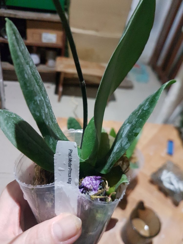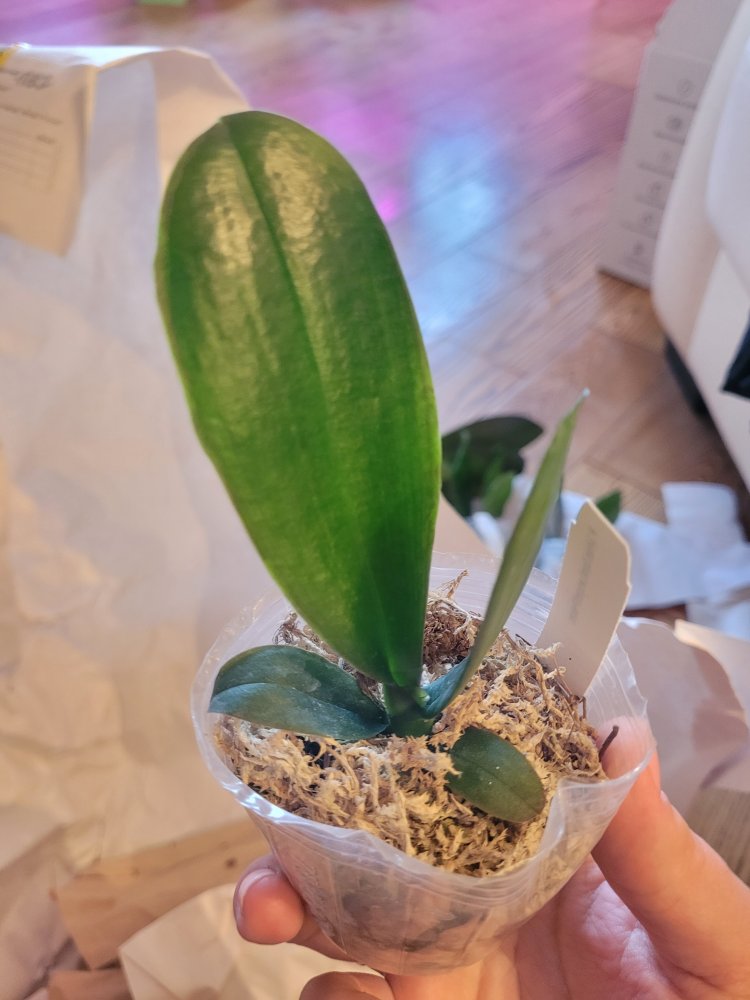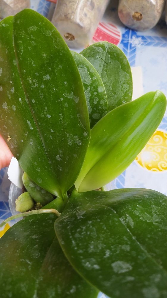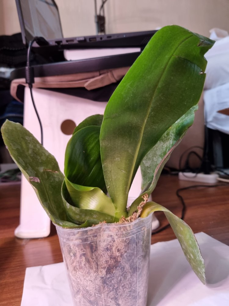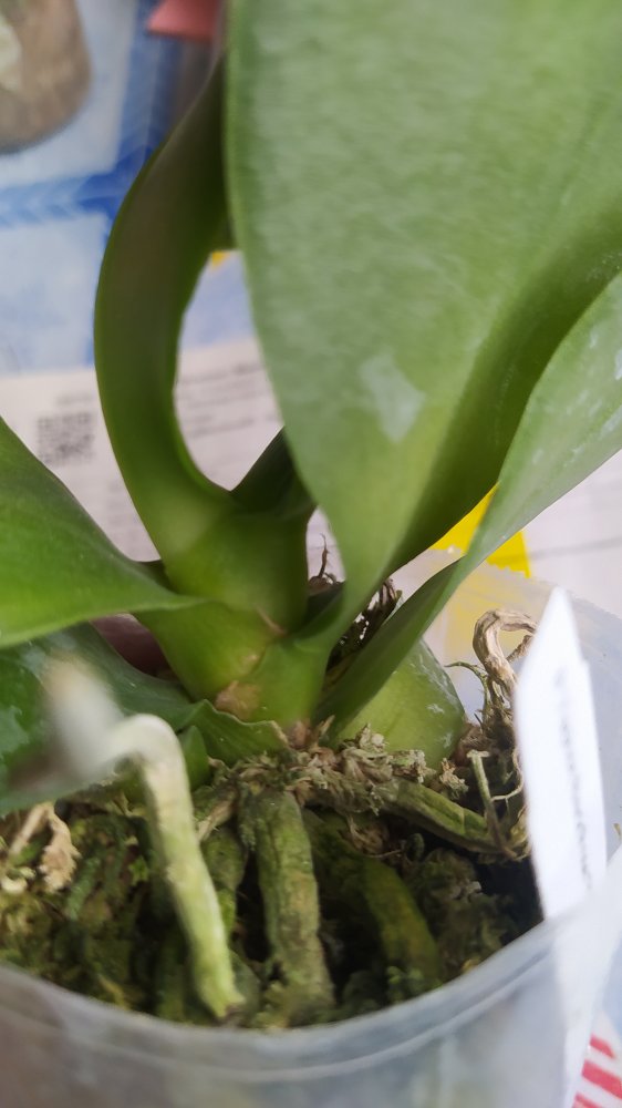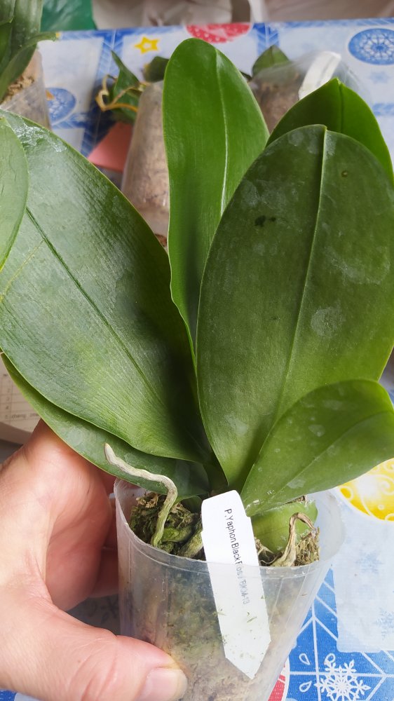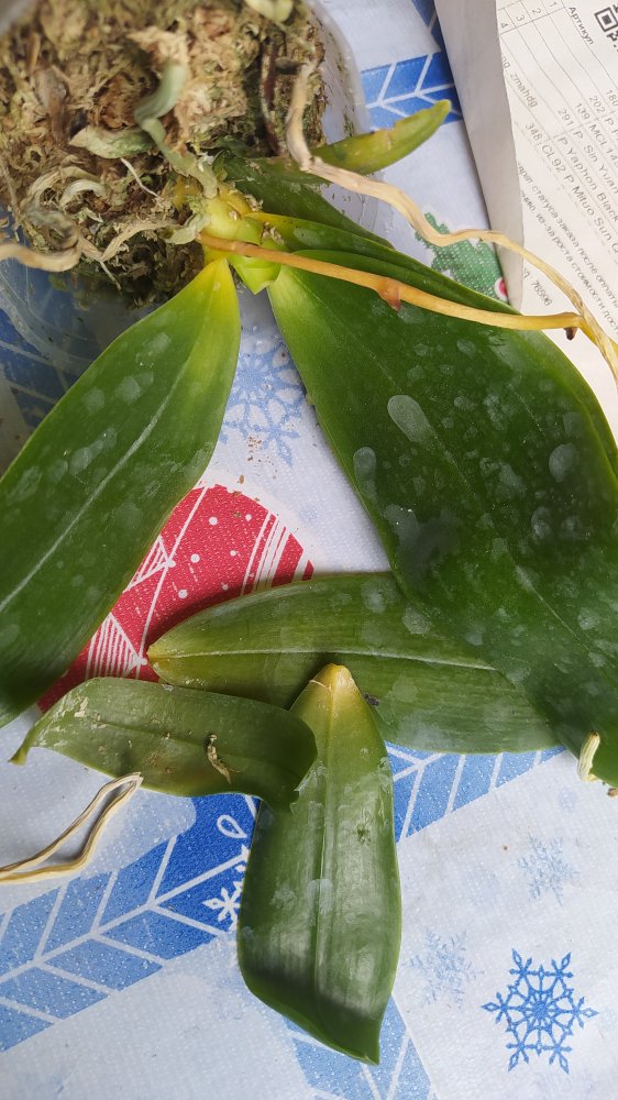 3. MCL145 Mituo reflex Dragon blue-2 - при разворачивании у него отвалился один нижний крупный лист. Когда осматривала для фото - ещё половина. У шеи черешки листьев жёлтые. Последний, самый молодой - тоже отвалился в процессе фото, ничего не крутила и не выламывала специально. Когда-то даже цвел. Но бирки у него нет, не первый раз от Яфон фаленопсис Миту приходят без бирки. Если выживет, узнаем.