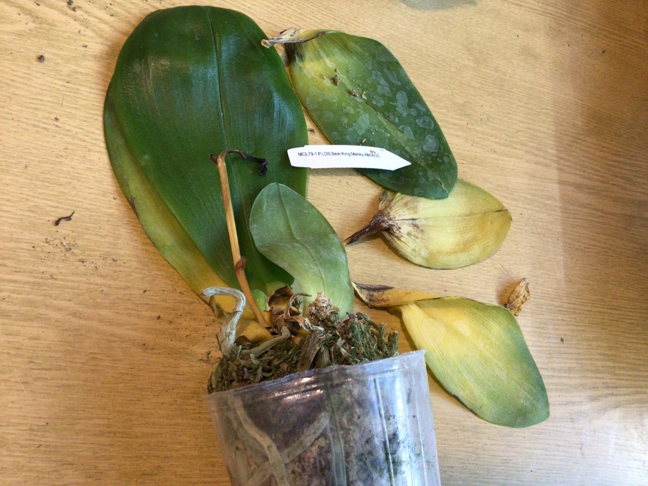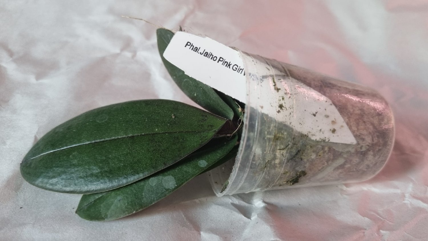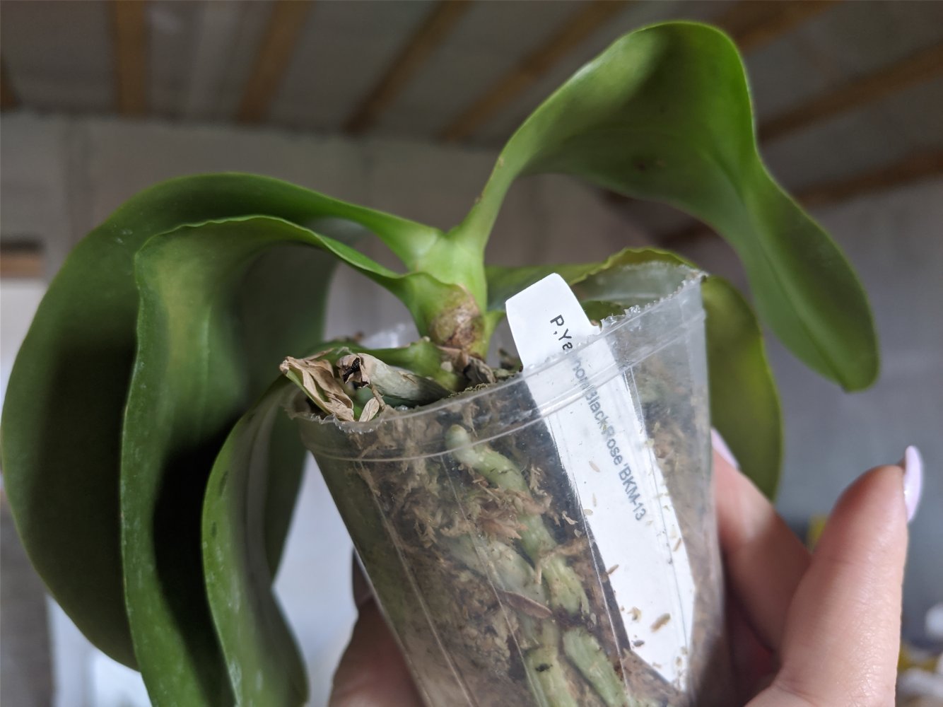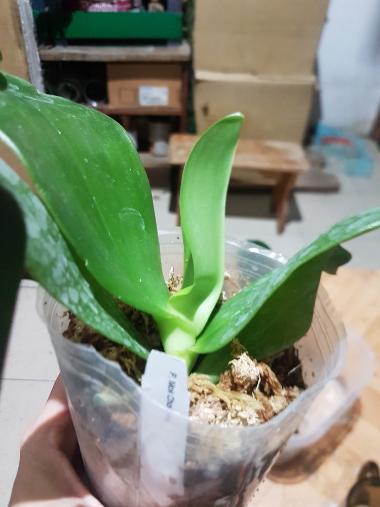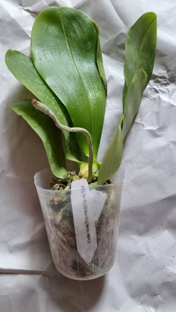 3. MCL145 Mituo reflex Dragon blue-2 - при разворачивании у него отвалился один нижний крупный лист. Когда осматривала для фото - ещё половина. У шеи черешки листьев жёлтые. Последний, самый молодой - тоже отвалился в процессе фото, ничего не крутила и не выламывала специально. Когда-то даже цвел. Но бирки у него нет, не первый раз от Яфон фаленопсис Миту приходят без бирки. Если выживет, узнаем.