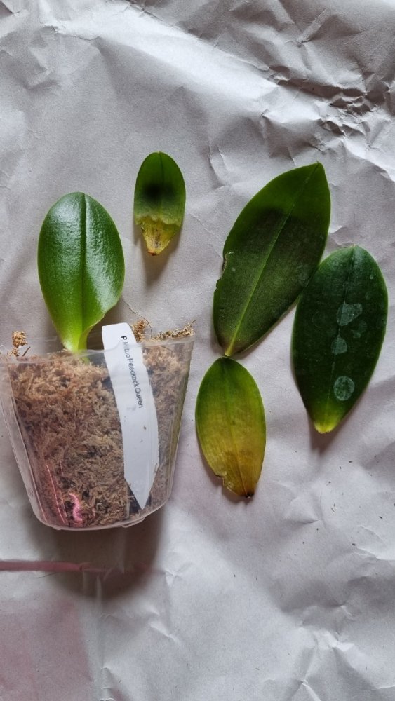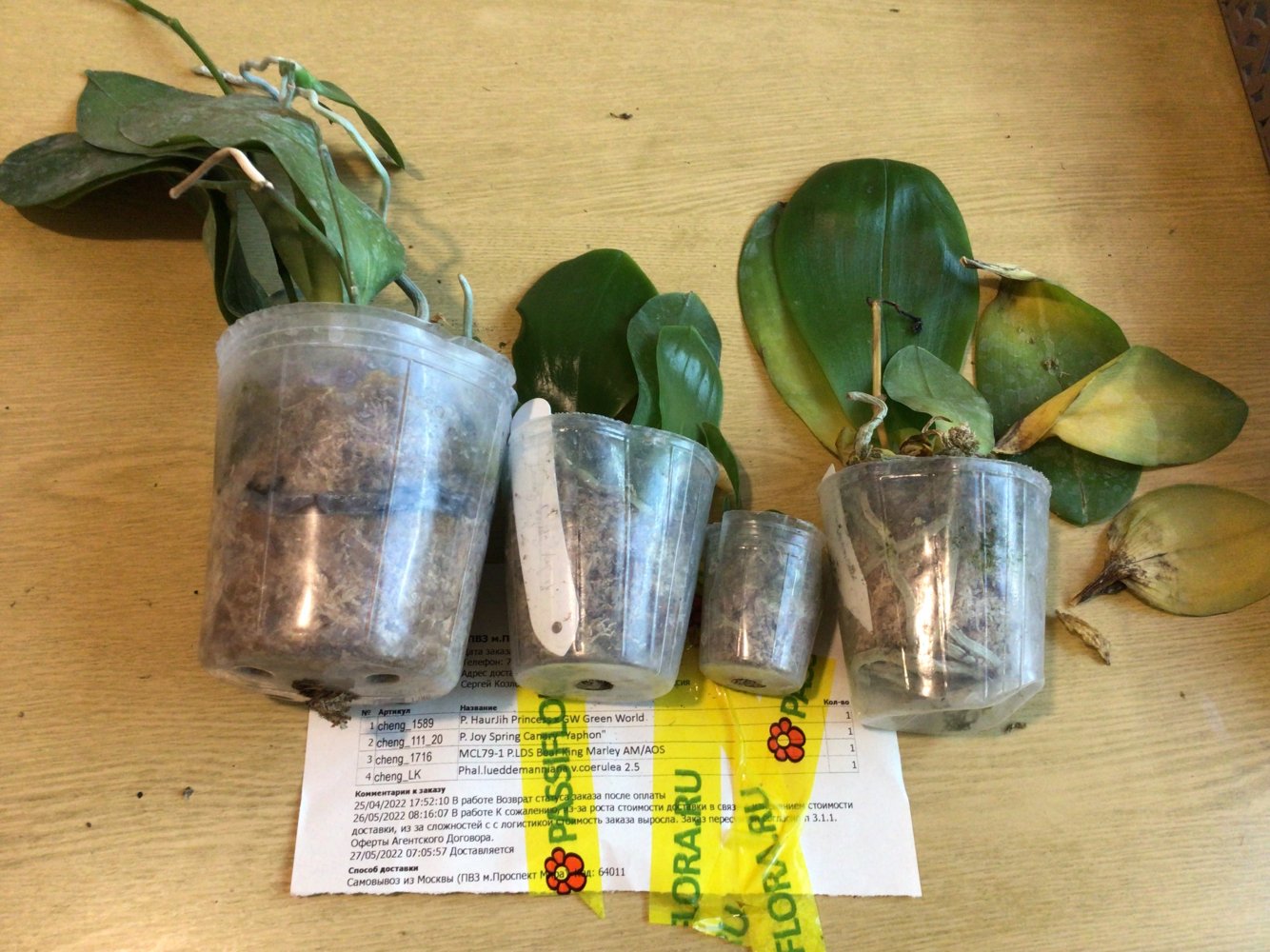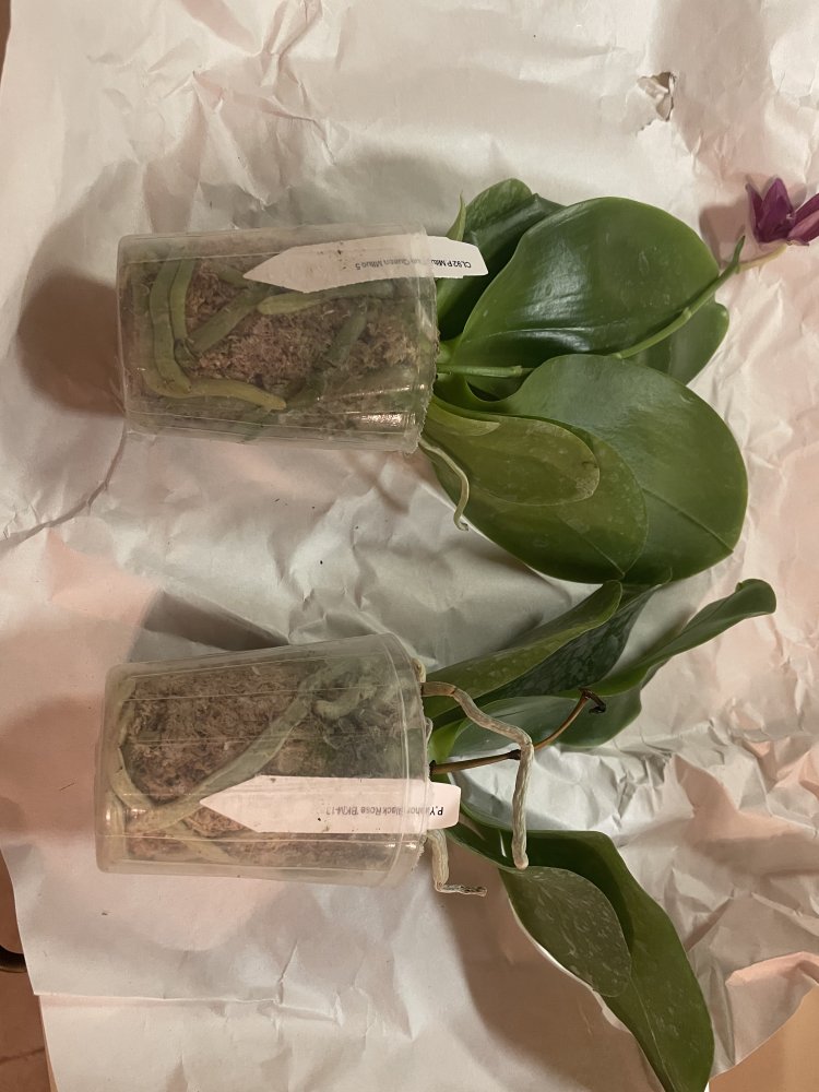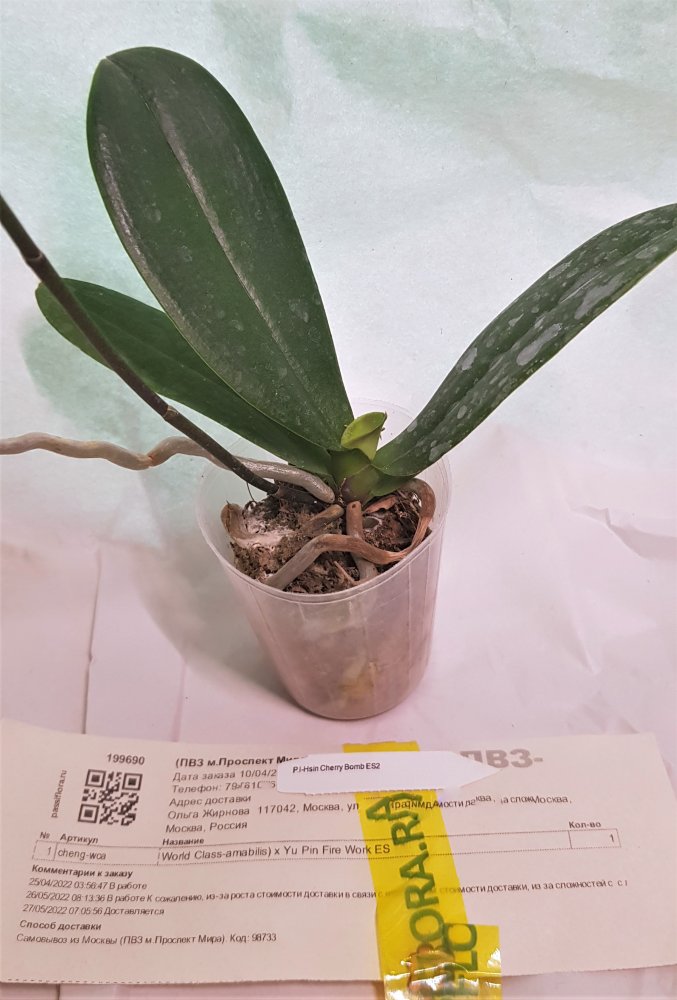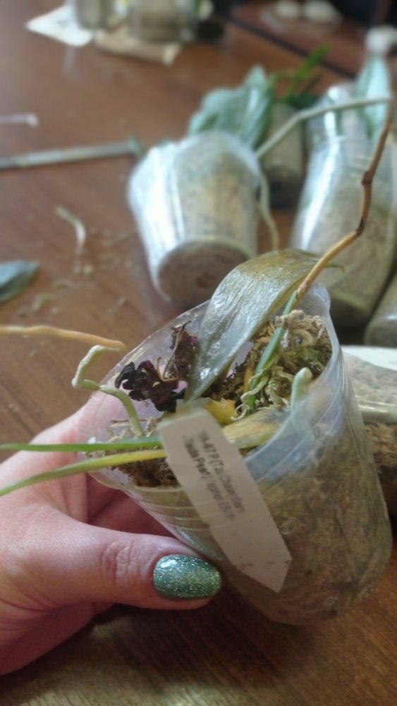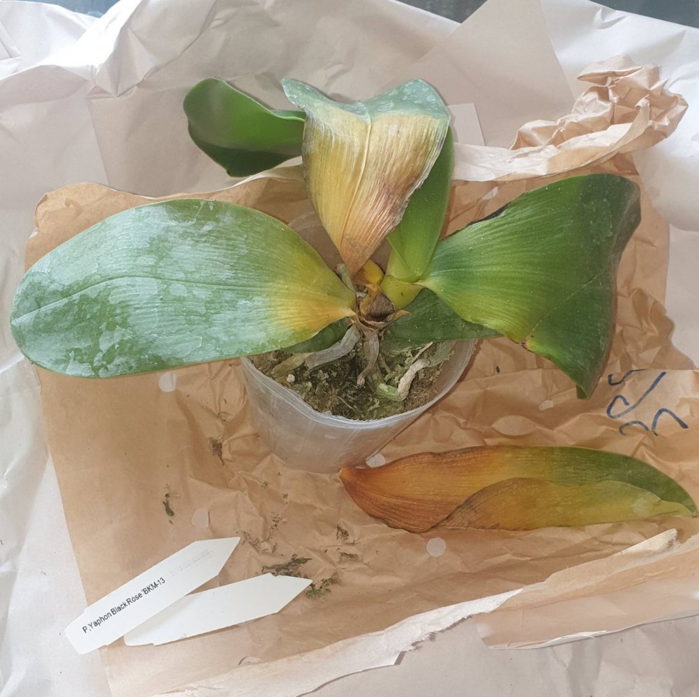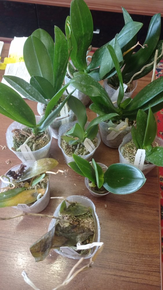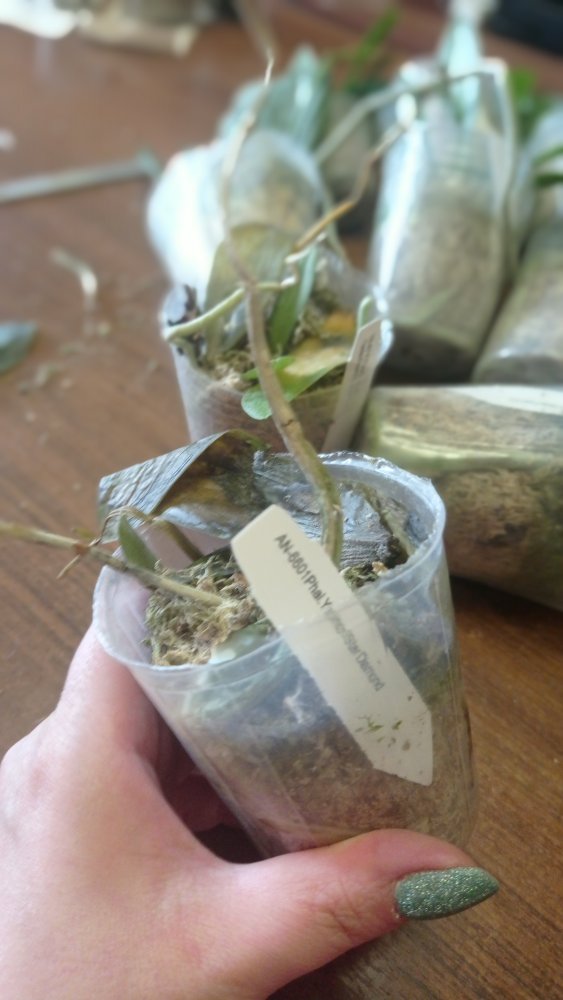 Все растения очень сильно пересушены. P. Joy Spring Canary "Yaphon" единственный, кто в приличном состоянии. Phal.lueddemanniana v.coerulea 2.5 заказывала только ради 2,5, так как 1,7 уже есть. Без бирки и опознавательных знаков. P. HaurJih Princess x GW Green World крупный с 3 цветоносами и деткой, но ни одного живого корня, только пара небольших воздушных, которые такую массу не вытянут. Смогу ли я вытянуть P.LDS Bear King Marley AM/AOS не уверена. Хотя отправлялось замечательное цветущее растение(((