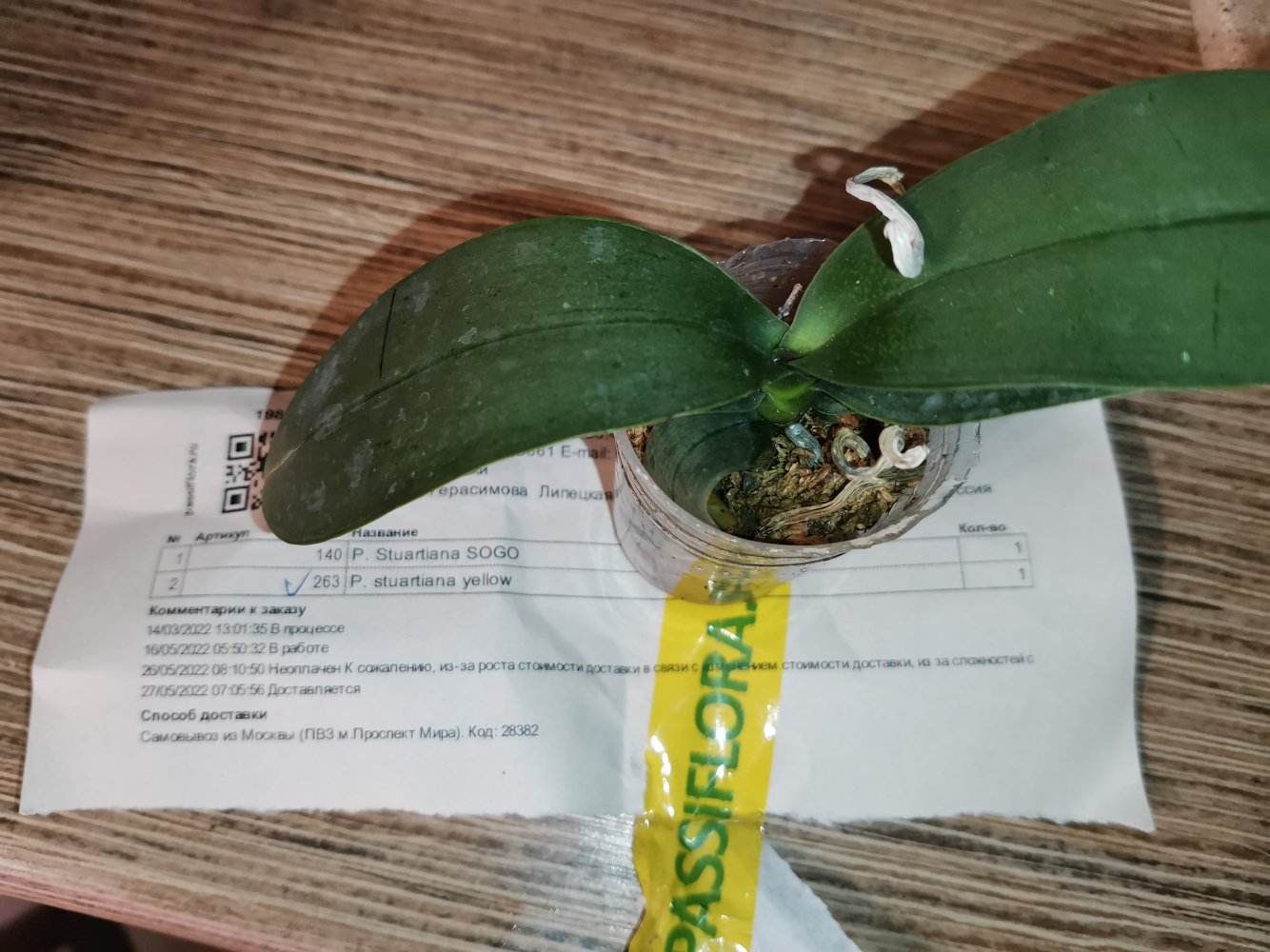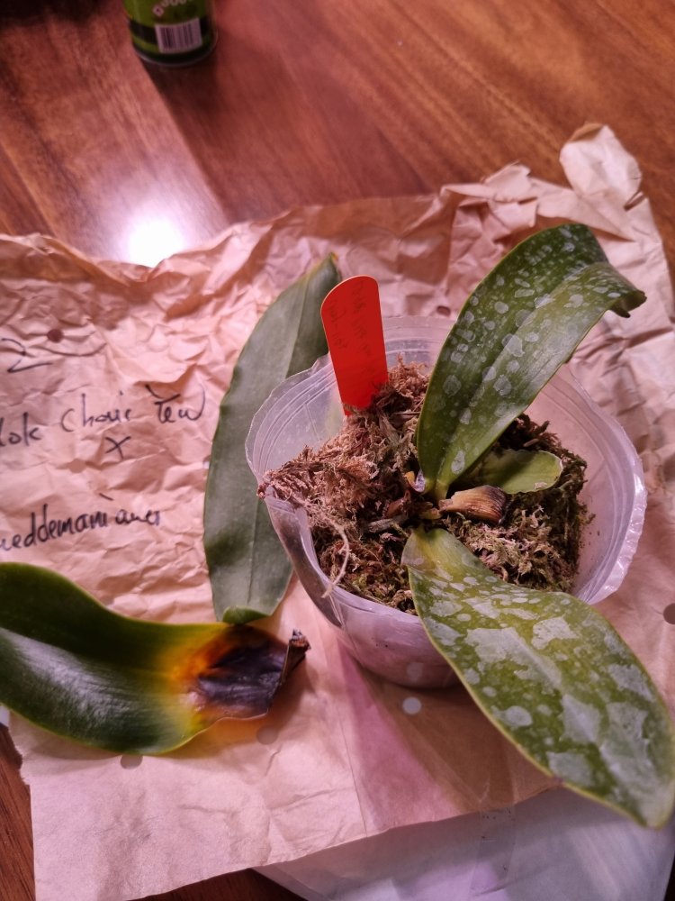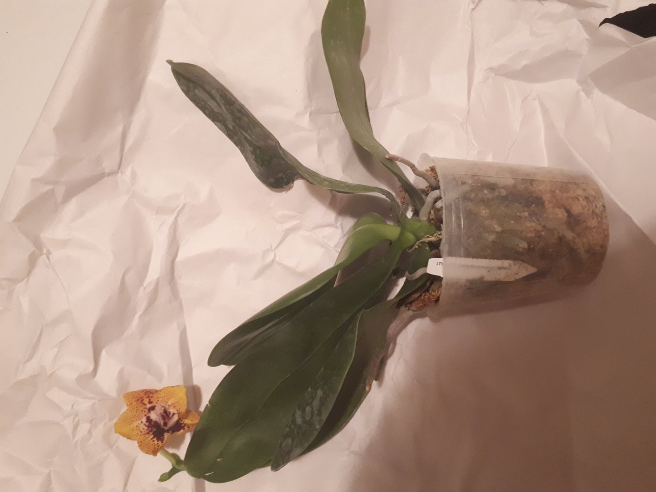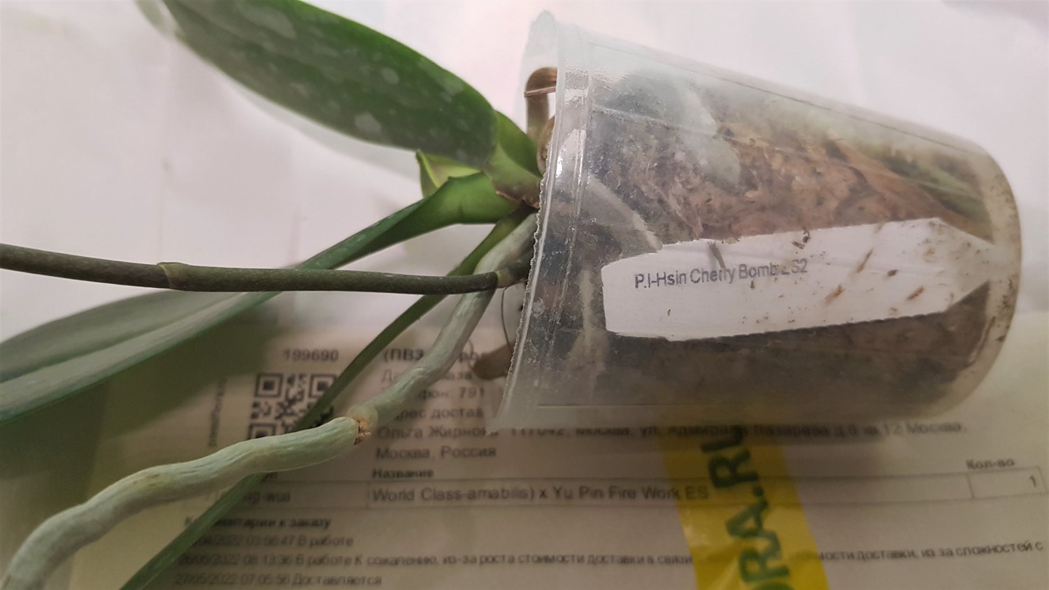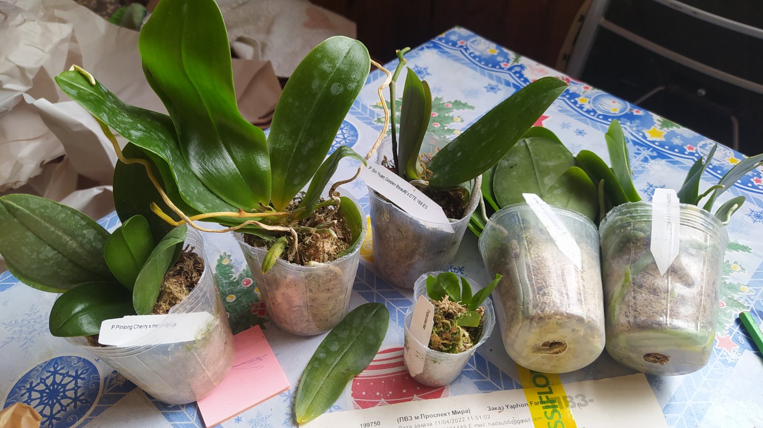 Все растения очень сильно пересушены. P. Joy Spring Canary "Yaphon" единственный, кто в приличном состоянии. Phal.lueddemanniana v.coerulea 2.5 заказывала только ради 2,5, так как 1,7 уже есть. Без бирки и опознавательных знаков. P. HaurJih Princess x GW Green World крупный с 3 цветоносами и деткой, но ни одного живого корня, только пара небольших воздушных, которые такую массу не вытянут. Смогу ли я вытянуть P.LDS Bear King Marley AM/AOS не уверена. Хотя отправлялось замечательное цветущее растение(((