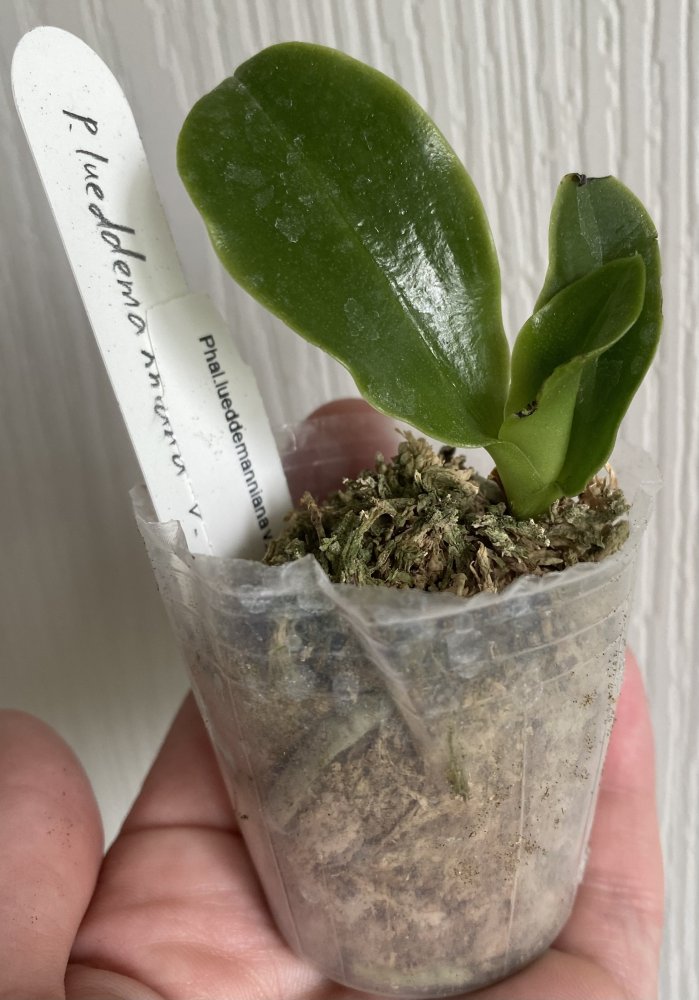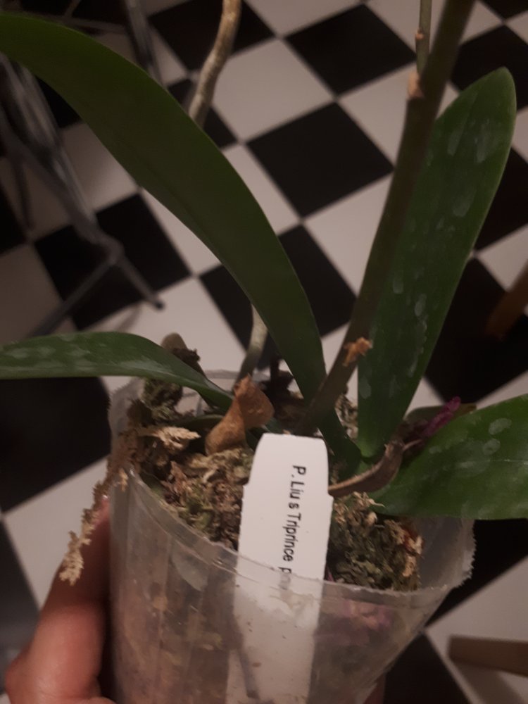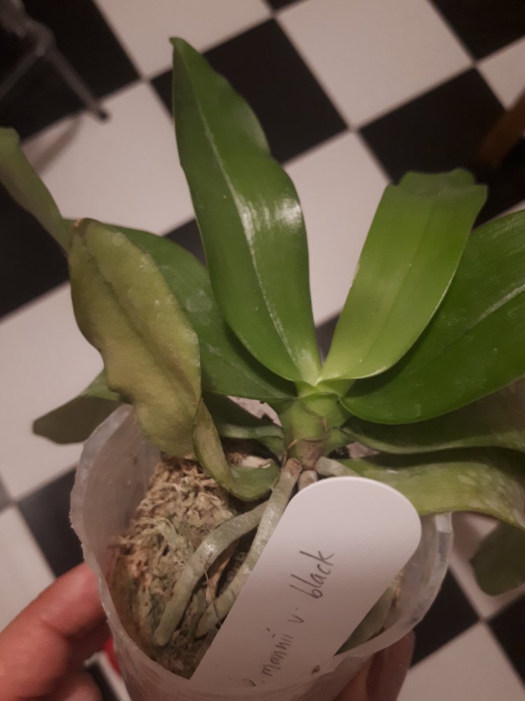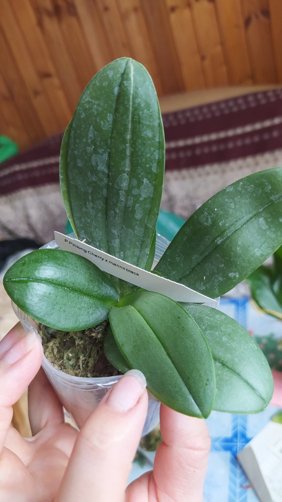 2. P.Pinlong Cherry x mannii black - красивущий! Как компенсация предыдущего расстройства, два в горшочке! Корешков ни одного не видно, вероятно, недавно пересажены. Но зато какие листья, фото моего телефона не передаёт красоты! Как брат-близнец shilleriana*manii black, очень интересно на цветение посмотреть. Бирка есть!