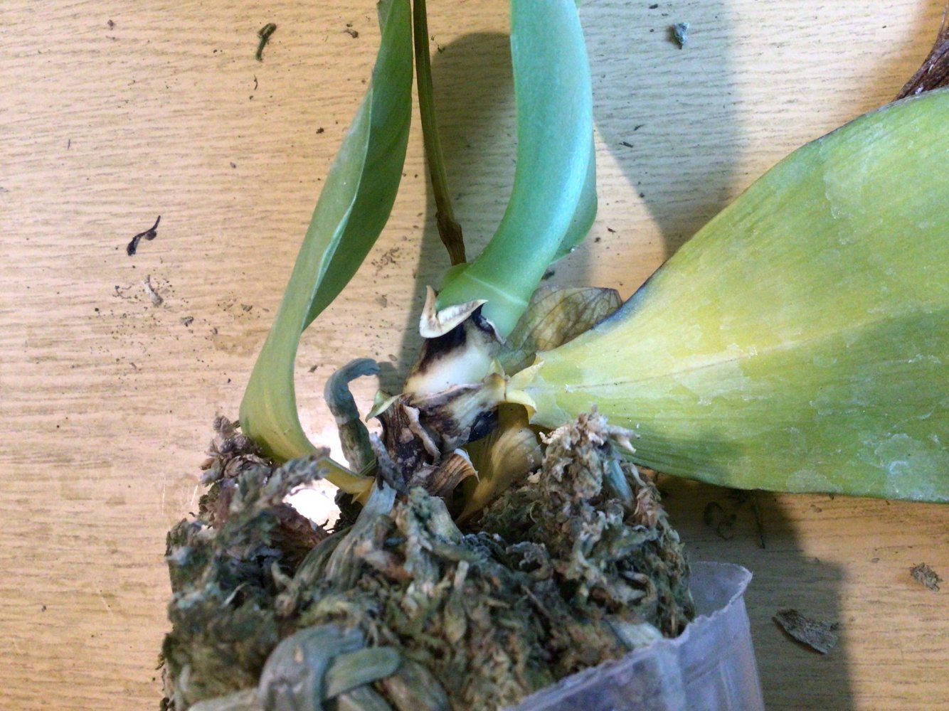 Минус самый основной в том, что растение болталось в горшке и пока я его осматривала, просто вывалилось из горшка, а внутри в центре пусто, даже старых тяжей не видно было, один единственный воздушный корень сбоку ушел в мох и всё. Листья вялые. Печаль(( Но не горе, ведь есть воздушные корни. Ещё заметила то ли цветонос, то ли детку. В общем растение требует заботы и внимания.
