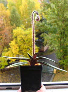 Меньше месяца назад, во время очередного полива, я заглянул в розетку St Swithin’a и к своей большой радости обнаружил там цветонос! Сейчас цветонос подрос уже до 25см. и по числу развивающихся брактей можно ожидать цветения четырёх цветков. Так что живу я сейчас исключительно в предвкушении этого, ну очень уж долгожданного события…