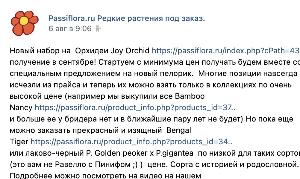 Ну, я в августе не ждала, а есть хоть какой-то месяц для ориентира? Октябрь? Январь? Март? Я не то что паникую, или требую, просто так спокойней, хотя бы примерно знать в каком месяце ожидать растения. И вас никто не дёргает и мне удобней распределять бюджет, получение и свое время на уход за растениями и свои поездкиРебят я нигде не писала о поставке на август. Потому что не так давно мы джоя получали новый в АВГУСТЕ никто не собирался привозить. Но теперь уже все пропало точно ибо кто то недопонял кто то второпях это недопонимание прочитал и растиражировал. А на выходе - "пассифлора обещала и не выполнила" хотя я как "отче наш" никогда не обещаю сроков ибо это не в моей власти вообще!