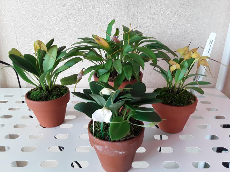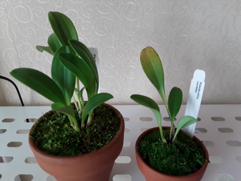 И самая большая неожиданность - вот эти две масдеваллии, полученные ровно год назад. Считала их полностью погибшими. Оставила просто ради интереса, посмотреть что получится. У той, что крупнее оставалось 3 листика, а у мелкой всего один (он на фото пожелтевший). Корни были все отмершие. То, что они выжили и выросли, считаю просто чудом)).