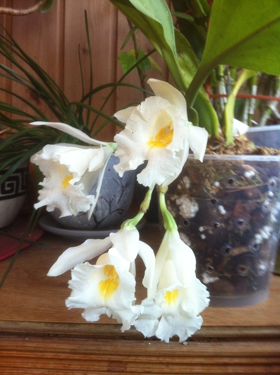Он у меня в орхиате крупной фракции. Зацвел скоро после получения. Пришел без цветоноса, но очень скоро его выпустил, так что это не моя заслуга :) Ну в общем в моих условиях вандовые в коре растить - идеальный вариант, т.к. поливаю я редко.