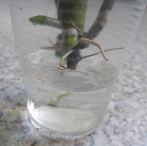 Присоединяюсь - в теплое и СВЕТЛОЕ место. А сухие или подпорченные корни я не обрезаю. Просто убираю веломен с корня. А оставшиеся корни помогут закрепить растюху в горшочке. С субстратом или без - как решите. Я ставлю в емкость с водой так, чтобы срез был над водой. А очищенные корешки или в воде, или над водой - как получиться. Вода конечно испаряется и ее надо подливать. Но следить , чтобы срез был сухой. Вот как-то так :поставьте в светлое, теплое место и наберитесь терпения. Корни, конечно зря обрезали.