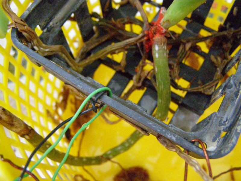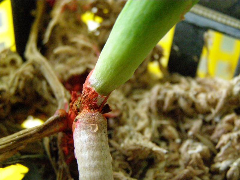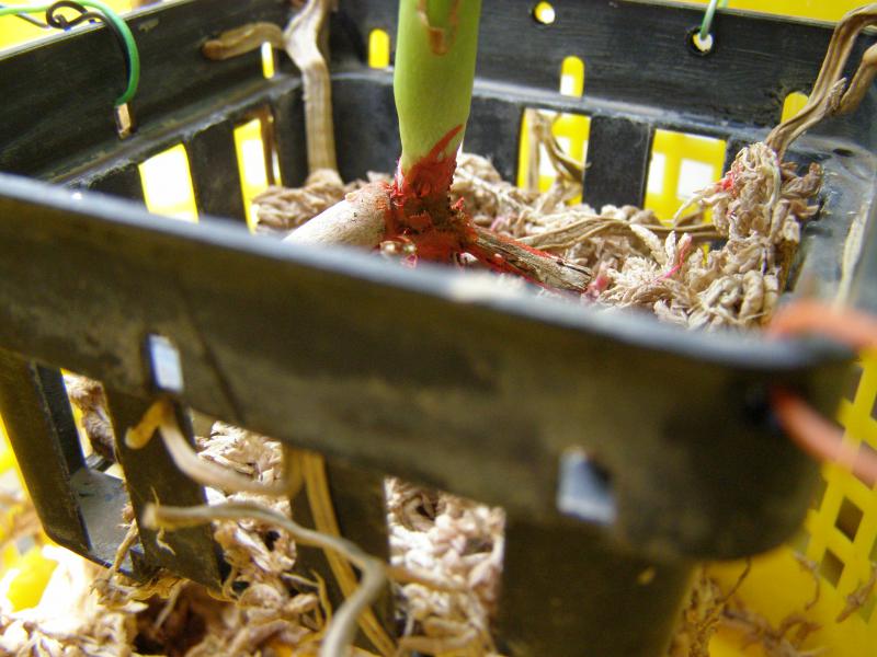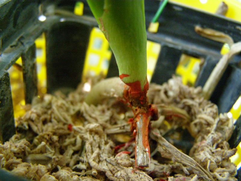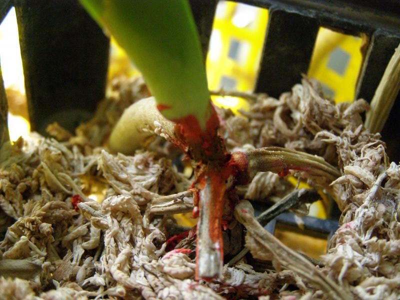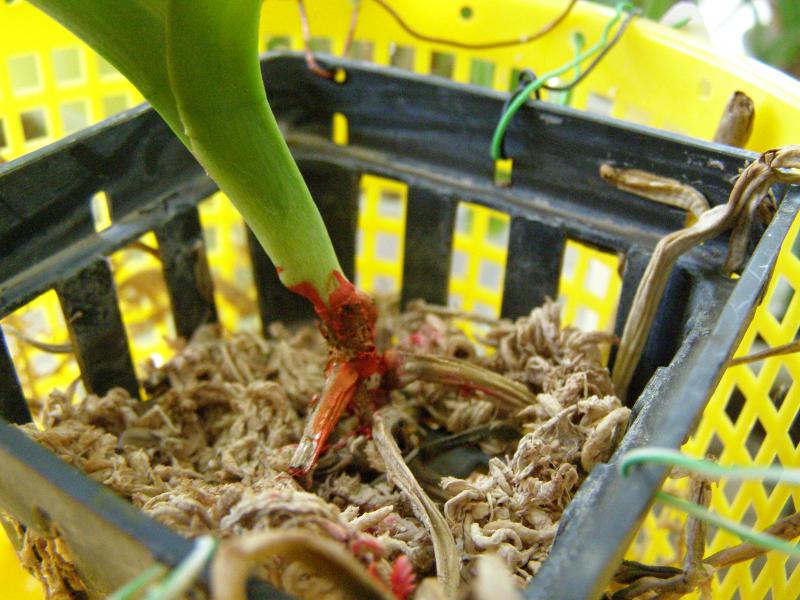 Ганна, хороший корень,пока,12 см. Сфагнумом прикрыты были все, но очень далеко от шейки и его очень мало. Он просыхал часа через три после полива, а сейчас быстрее. Перед посадкой были все зеленые. Пришла с голыми корнями в черной корзиночке, как обычно. Корни стали усыхать месяца через полтора. Увлажнителя нет. Но организовать мисочку для одной вандочки можно. Где сейчас чернота, там было два листика. Они начали как бы надрываться и отпали зелеными. Жалею, что сразу их не оторвала, так как черноты сначала было меньше, такое впечатление, что она наросла на стволике, пальцами стирается, осыпается. Я и стволик -то почти не трогала. Чернота эта как будто съела его ткань. Он стал тонкий в этом месте. На фотографии кажется такой толстый стволик, а на самом деле внизу у корней он в диаметре 0,5 см. Вандочка очень маленькая, высота всего 15 см, листья такие же, но это ее размер ВS. Миниатюрная, но почти взрослая. Первый раз с таким столкнулась.
