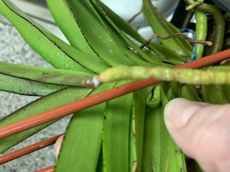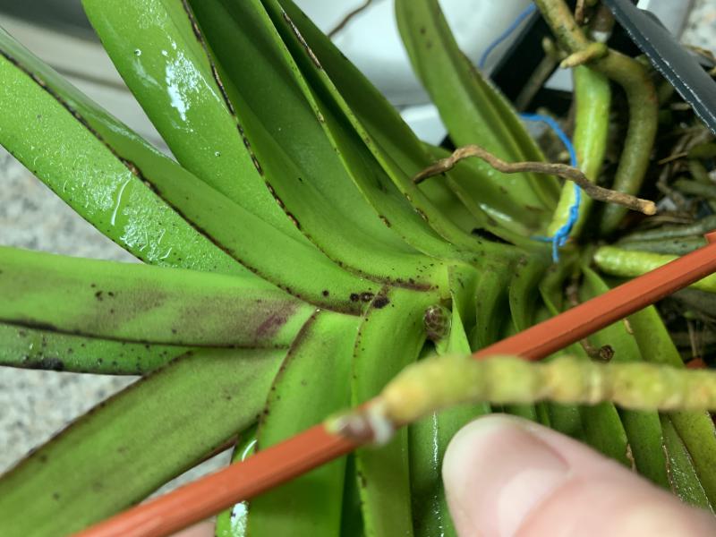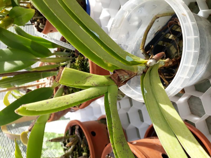 Получила Аскоцентрум, корней много, но листьев многих нет, шея вся в темных чешуйках (сухих). Пока только обработала зелёным мылом, хочу наверное ещё фундазолом намазать... Или стоит счистить все чешуйки, чтобы изучить состояние шеи? А потом уже мазать..