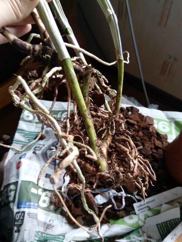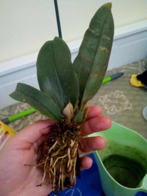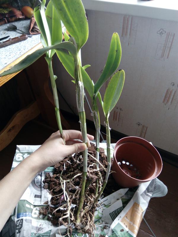 Каттлея Cattleya skinneri 'albescens' обошлась в 3900р. За эти деньги получила большую деленку очень крутой лесенкой. Она была воткнута в горшок, в котором никогда не росла. Удивила глубина посадки и я её достала из горшка. Сразу стало понятно, почему она так воткнута. Посадить как есть такую крутую лесенку в горшок нереально. Нашла 3 пня от обрезанных п/бульб в разных местах, есть побитости.