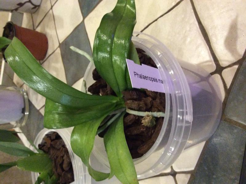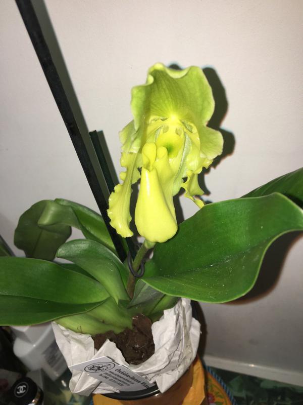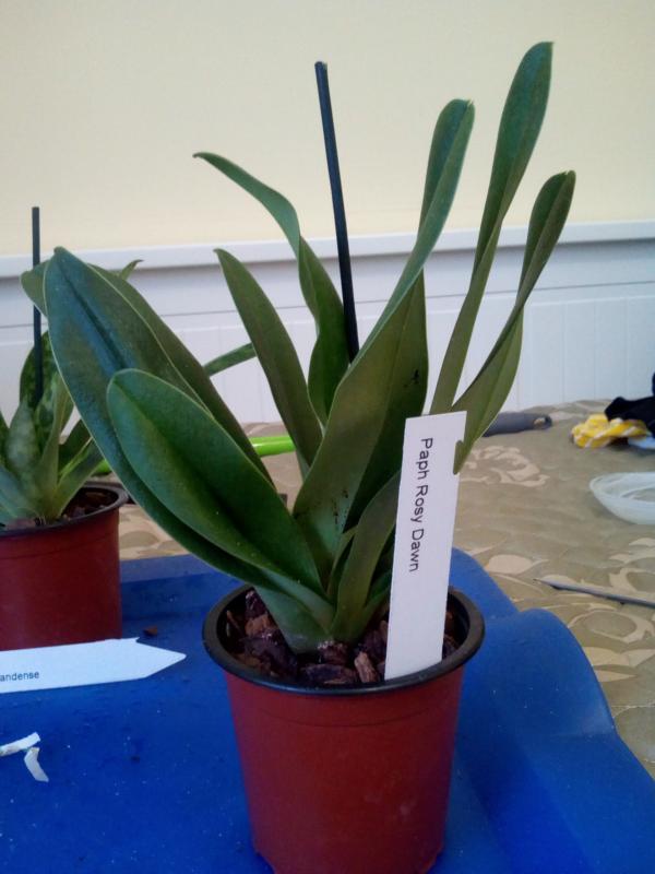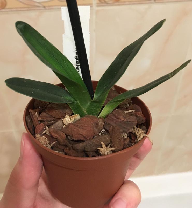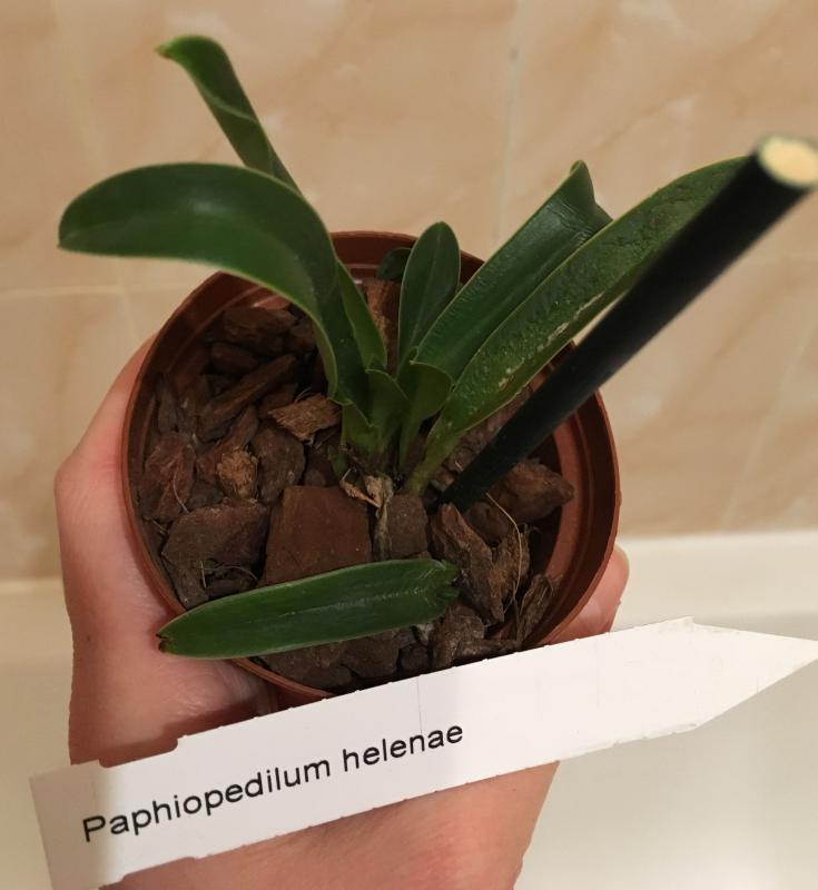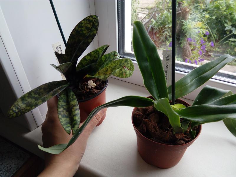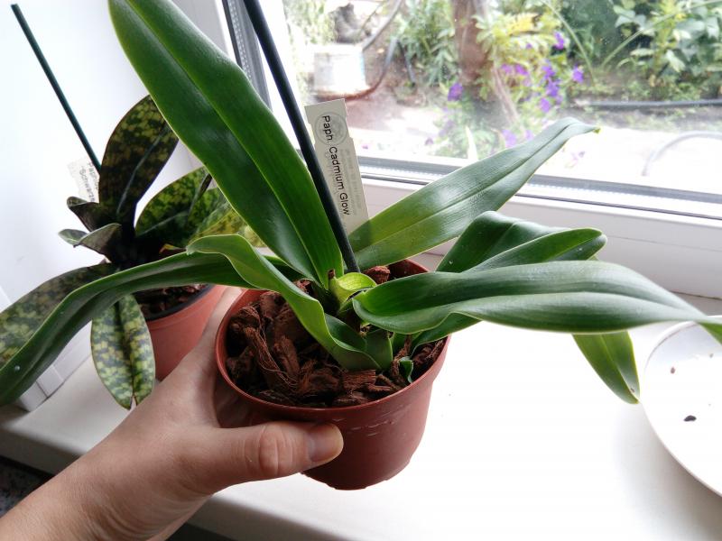 Paphiopedilum Cadmium Glow. Некрупная цветшая розетка и хороший новый рост. Корни не очень, поменяла грунт. Листья светло-зеленые, чистые.