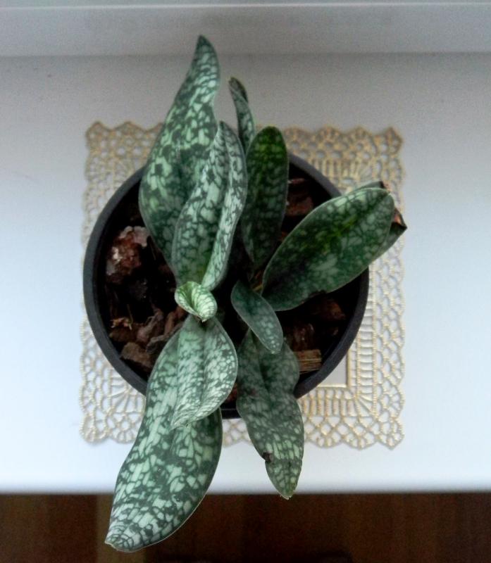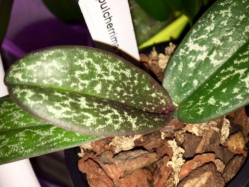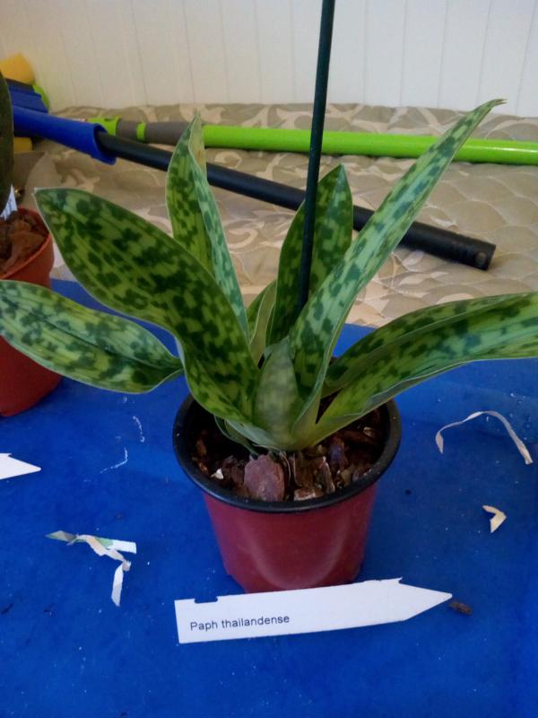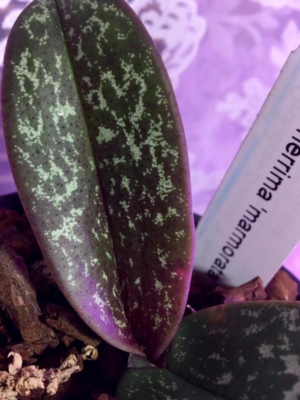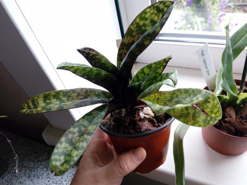 Paphiopedilum Vinicolor 'Schwarze Madonna'. Одно хорошая розетка с чудесными пестрыми листьями. Есть побитости и заломы на листьях. Корни не очень, пересадила.