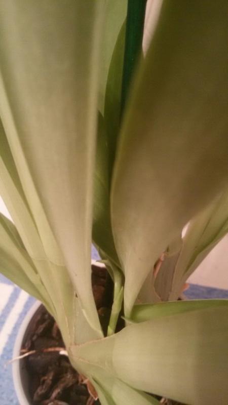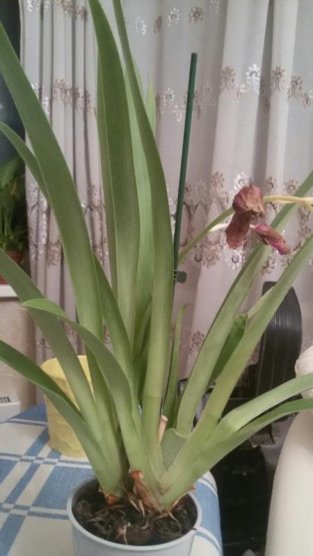 И есть еще одна свеже купленная. Была с 2мя цветоносами. 1-ый распустившийся быстро отсушила цветы (возможно причина яблоки привезли на кухню?). Неделю назад распустила 2ой цветонос, но он тоже за два дня засушил все цветы. Сегодня нашла новый цветонос, но он еще только появился (в высоту см 7). На вид ботва вся хорошая зеленая без гармошек и корни на вид нормальные. внутрь горшка не лазила, т.к. побоялась дергать цветущую растюху.