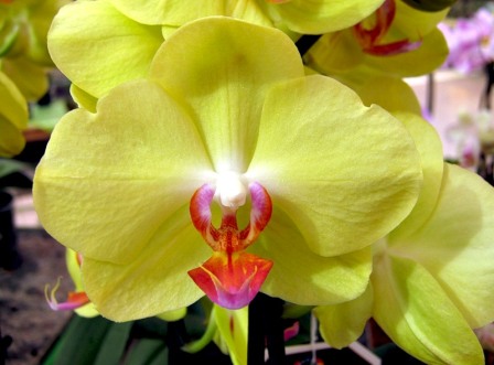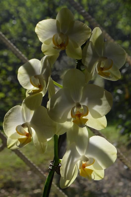 На фото цвет испорчен, в начале цветения был желтым с розовой губой, постепенно цветы выгорают до пастели.
