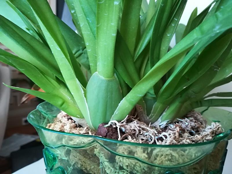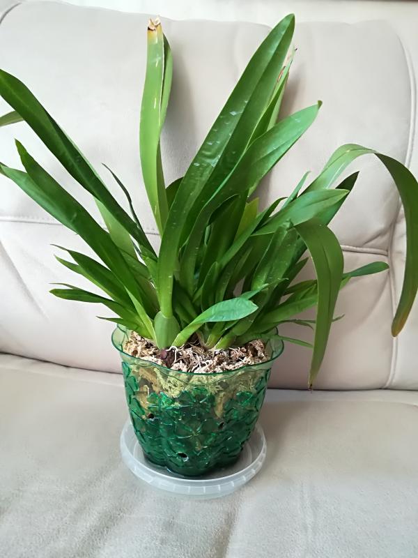 Получен в подарок, после пересадки распался на две части. Одна часть(бульба) еще в прошлом году начала растить рост, но он маленький вырос, то есть бульба мелкая. Другая, из двух бульб, отцвела, после цветения прошло около полугода, тоже сейчас растит рост, боюсь, что тоже вырастит мелким, вообще он ооочень медленно растет, поэтому интересуюсь про уход, может я что-то не так делаю - поливаю после просушки, растет в мелкой коре со мхом и кок. чипсами, удобряла редко, недавно под мох насыпала оргавита. Возможно надо поливать почаще и дело пойдет быстрее и бульбы будут потолще? И если кто знает, подскажите "имя" его?