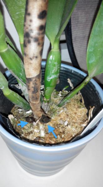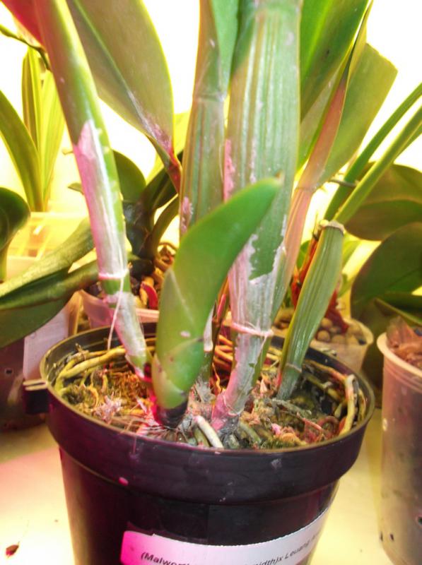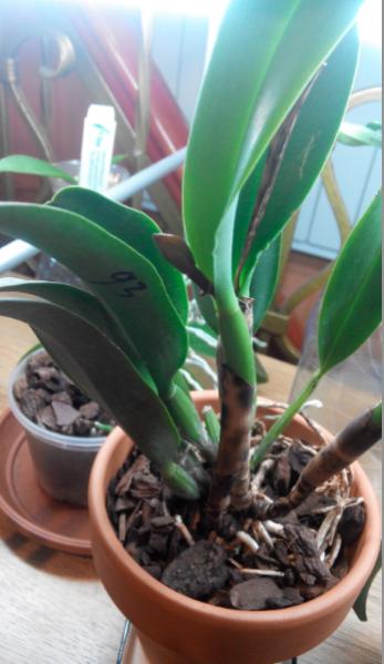 Где-то в августе была пересажена в кору. Схудала, но дала новые корешки. Росты выросли длинными и худющими.