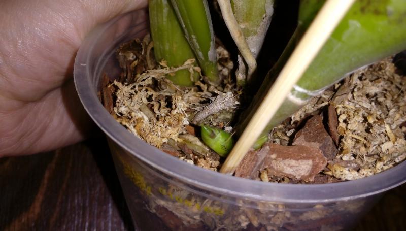 Я же написала, что пришла в начале апреля 2018 уже с цветоносм. Сидит в пустом горшке (изначально так росла - корни к горшку присосались, но внизу какой-то комок то ли мха, то ли торфа болтается, корней в нем нет), поливаю как бог на душу положит, брызгаю периодически. Растет под диодами. Фаленопсис фаленопсисом. Отцветет - попробую выковырять этот комок и посадить как нормальные фаленопсисы.