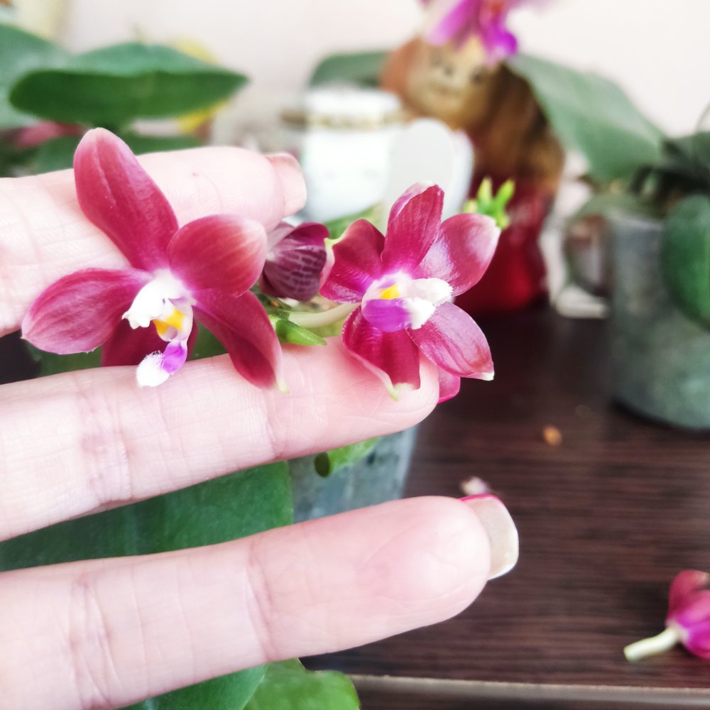И все 4 цветочка у Phal. Yaphon Black Rose BKM-13, четвёртый бутон формировался уже под лампами, поэтому наглядно видно как отличается окраска