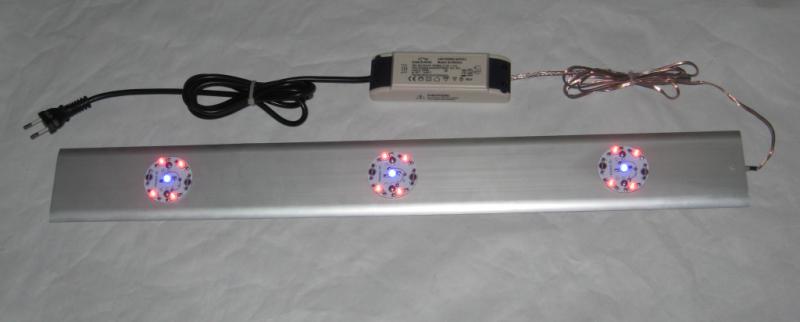 Содержит 12 красных (длина волны 660nm) и 3 синих (445-450nm) мощных светодиода на алюминиевом профиле и драйвер питания.