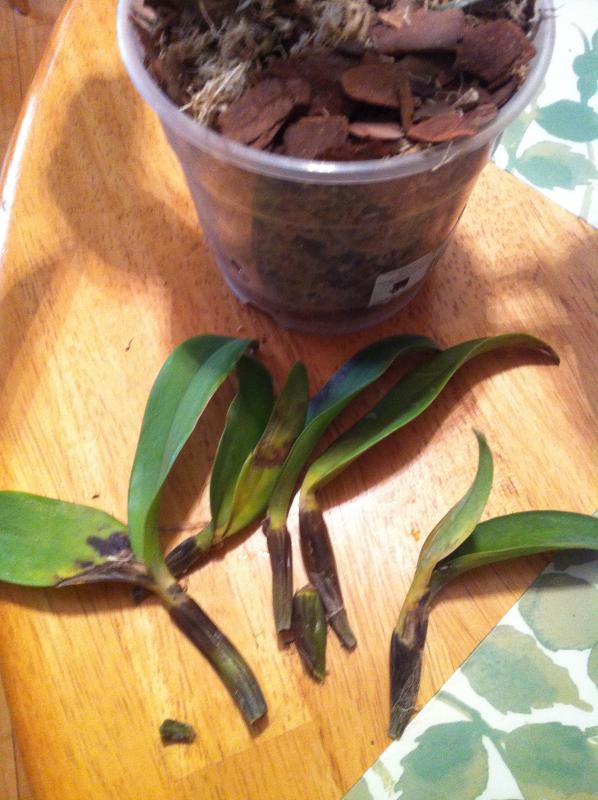 Пришла огромная каттлея с кучей ростов. Была вся зеленая, внезапно появилась такая темнота на бульбах, переходящая в пятна на листьях и стала распространяться на другие бульбы.