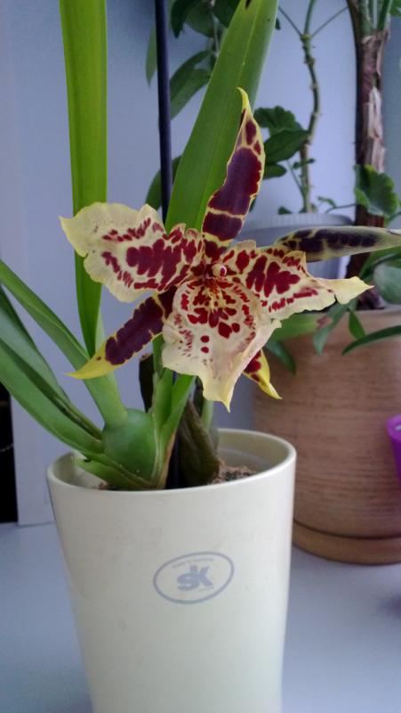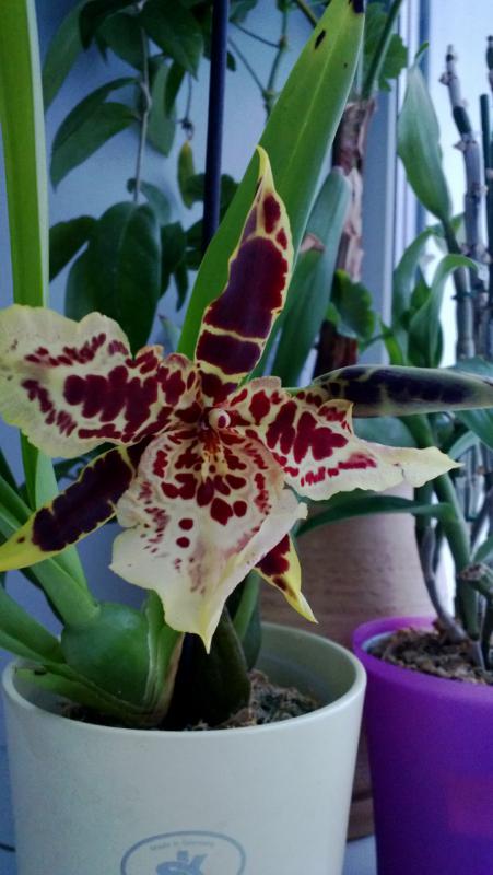 Расцвела покупная камбрия. Я ее определила как Bakerara Flying High 'Stars and Bars' (Aliceara Jet Setter x Odontoglossum McNabianum). Два месяца цветонос рос. В этом году всего 2 бутона, в прошлые годы было по 5-6шт. Летом на балконе держала, видимо ей слишком жарко было. Размах крыльев 9 см. Пока не пахнет, но аромат должен появиться, гвоздичкой должна пахнуть.
