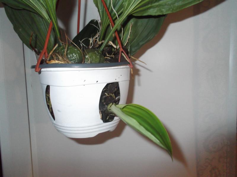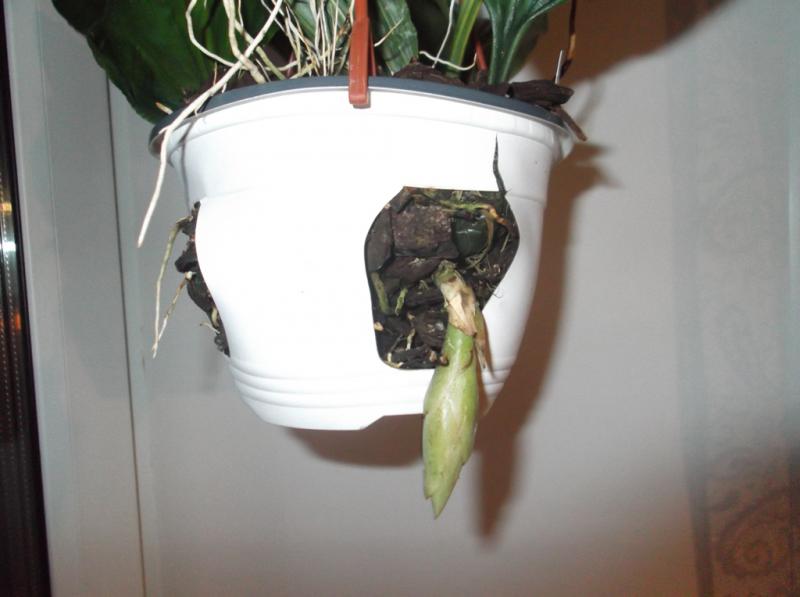 Да, перевалила, как есть со всем хозяйством- рост+цветонос. Все у нас на месте и рост тоже при нас. Причем пришлось это делать аж 2 раза. Первый раз поселила ее в корзину с кокосовым волокном и потом поняла, что это не вариант, на следующий день поселила ее в самодельную корзину из сетки. Делать корзину пришлось ее прямо на самом растении. Судя, по результату, все понравилось!