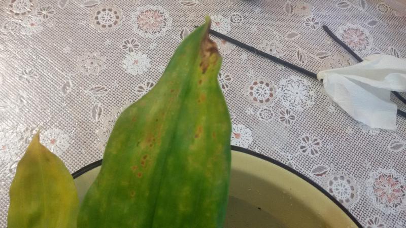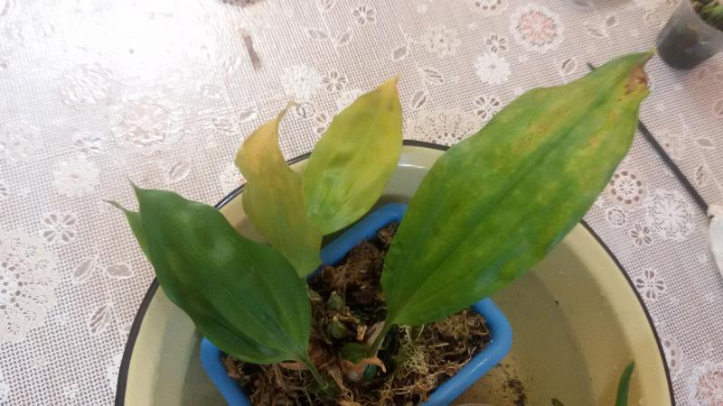 Здравствуйте, подскажите что с листиками моей стангопеи? Получена была в апреле, пересажена в смесь орхиаты, мха, немного осмокота, корзину обложила мхом. Пришла с ростом, который с формировался в бульбу, которая уже дала новый рост. И другая бульба тоже дала рост. Все было отлично, но вот пару дней как появились пятна и листья на старых бульбах желтеют. Поливаю погружением, когда верх просыхает-пшикаю. Что это может быть? Стоит на северном окне с подсветкой.