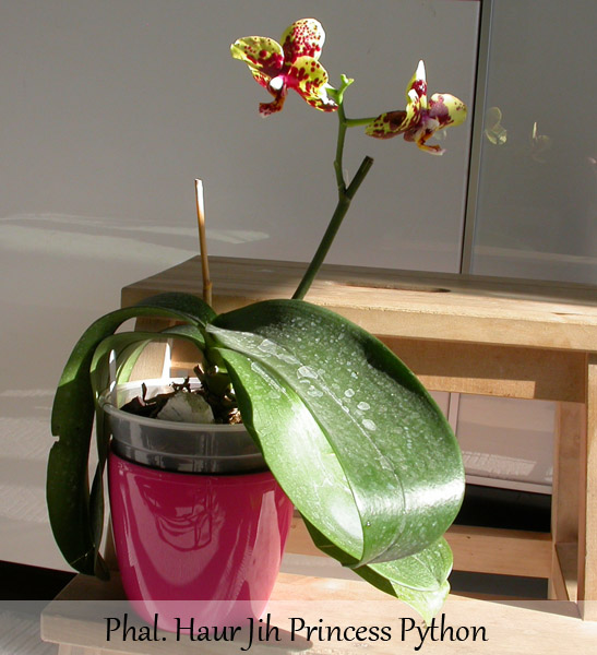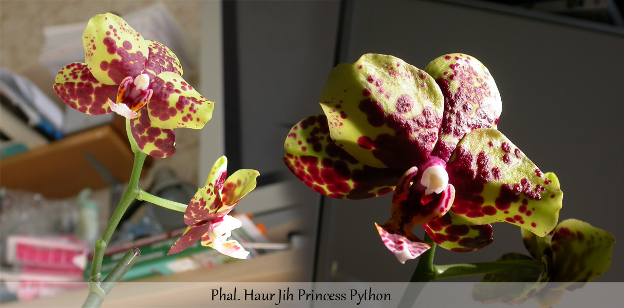Зацвел с бокового ответвления обрезанного цветоноса. Цветок небольшой - 6,5 см (по крайней мере этот, на новых цветоносах буду надеяться на бОльший размер). Без запаха, пупырки выпуклые. Окрас не так богат, как у каталожного питона.