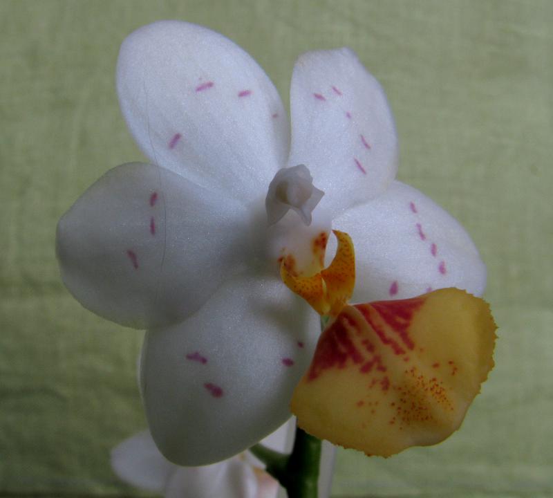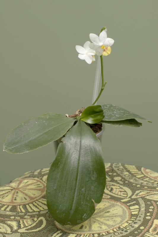 Милка13, самый большой лист 16 см уже, но мне наверное он кажется компактным на фоне некоторых моих фаленопсисов с листьями по 30 см. Вот ещё картинки - та же в полный рост, только фото посветлее - мне кажется так он лучше и цветочек в макро. Цветонос, кстати, ветвиться начал. листья светло-зелёные, слегка волнистые, тонкие. Верхний лист отрезан и растёт уродцем - он пришёл с гнилью.
