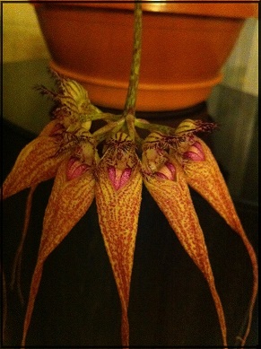 Bulbophyllum (Cirrhopetalum) Elizabeth Ann 'Buckleberry' Цветонос на третий день был сломан (кем - загадка:uncertain, так что цветением насладиться не успела Цветы длиной 12-13см