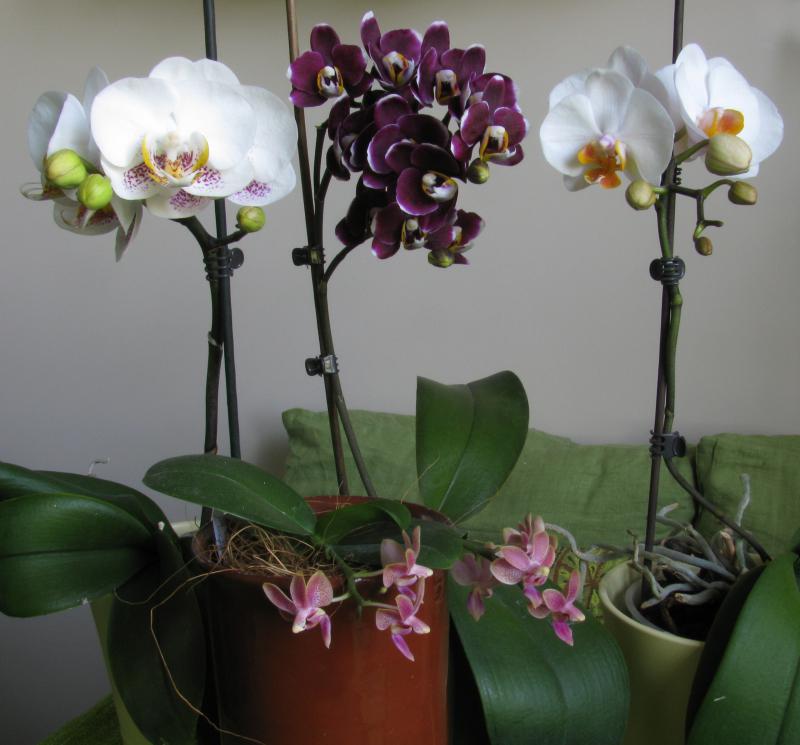 Для сравнения - 3 больших гибрида и один маленький Phal. Carribian Sunset X minus дружно цветут.