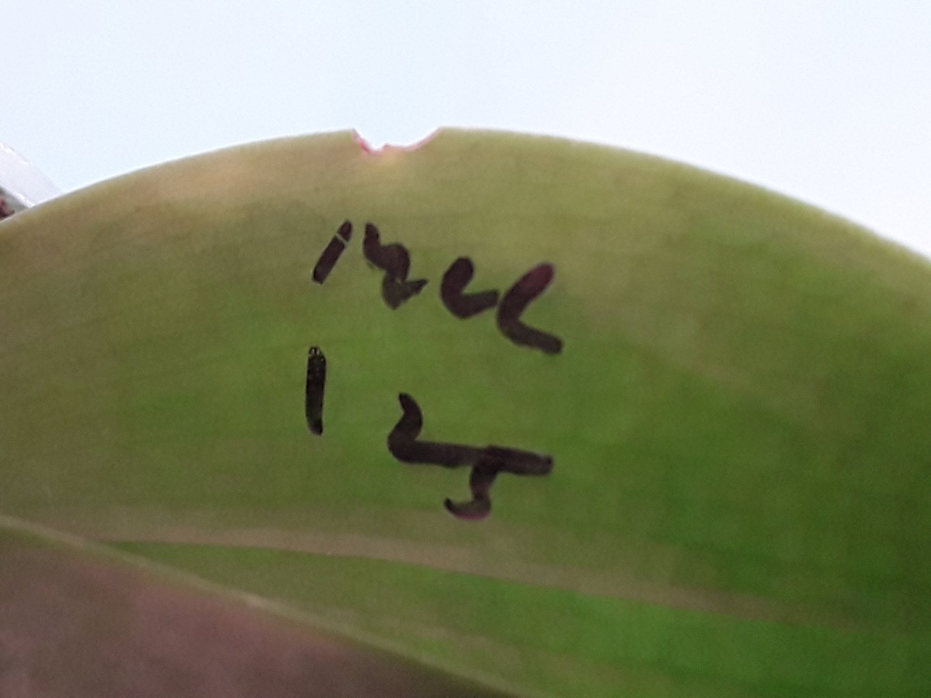 В каталоге в разделе наличие тоже есть фотки прошлогодних, я так понимаю. Там код тоже виден на листьях.Для тех, кто сейчас Панду получил, сфоткала код на листе на своей. Сравните, должен быть такой же. Это MCL 125, можете для себя отметить или записать, а заодно проверить дополнительно в инете, что это именно то растение. Заодно глаз будет наметан на почерк Миту)).