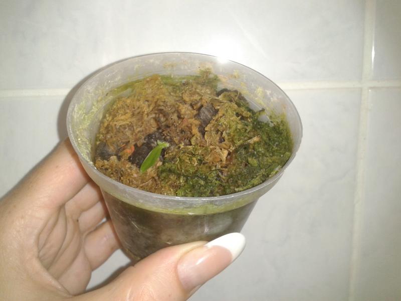 сухой вообще, я просто поливала орхидею, которая стояла на этом горшочке- методом пролива и ставила сверху и все, видимо немного влажность там была и типа теплицы и пророс малыш, хотя и не знаю из чего там реально гнилое и коричневое все было, просто горшок с корою и мхом более тяжеленький чем пустой (использовать для поддона)