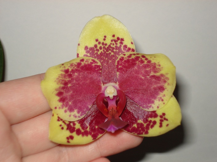 второй день роспуска. он, конечно, не такой как на фото в заказе, но бесспорно красив. цветок крупный (по нижним сепалиям 8 см), восковой, тяжелый. есть слабый аромат - что-то свежее цветочно-лимонное
