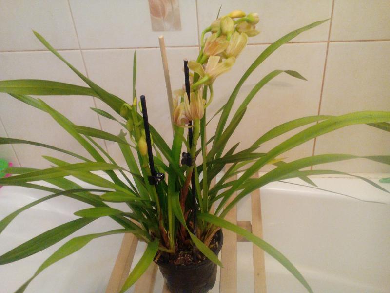 Cymbidium Gem Stone. Получила большой цветущий куст - 4 взрослые бульбы с листьями и 2 новых роста. Пересаживать не стала, немножко покопала пальцем кору - много живых корней. Придраться не к чему - растение идеально. Большое спасибо за заказ!