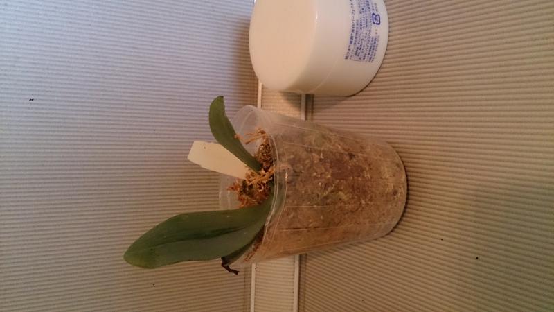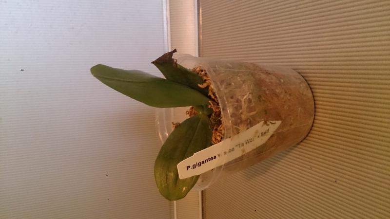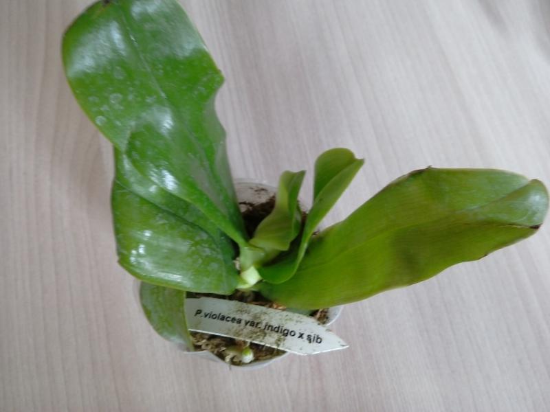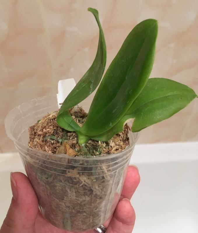 Огромные три листа, самый нижний надломлен у основания, но пока держится. На листьях местами сухие тёмные пятна, структура второго листа неоднородная. Два пенька от цветоносов. Горшок 3,5, мох очень влажный, в горшке грибы и подуры, некоторые корни подпрели, некоторые сухие, но в целом нормально. На бирке напечатано "P.Brother Princess Hai Tony"