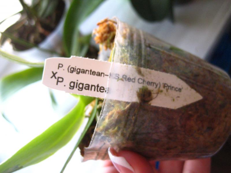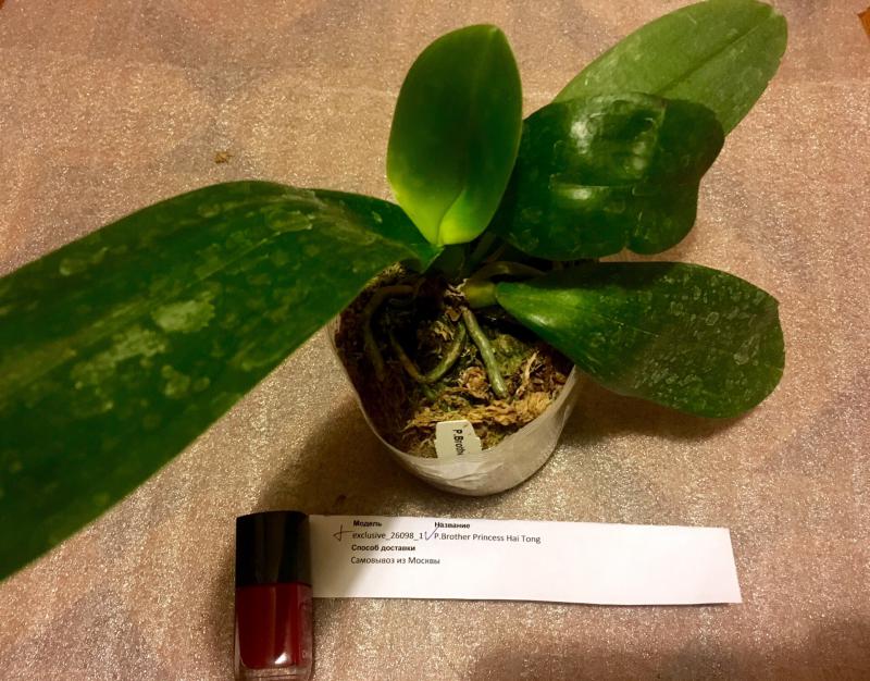 Растение пришло в слегка влажном мхе в полиэтиленовом горшке. Во мху обнаружена влажная свечка удобрения. Бирка имеется, правда короткая и надпись на ней "P.Brother Princess". Вот уж и не знаю: действительно это сорт 'Hai Tong' или решили на бирке сэкономить.