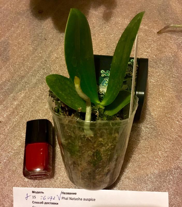 Пришёл в горшке со влажным мхом. Хороший такой живенький, 7 листев, самый большой лист 15см, с цветоносом! Корешки жирные, на некоторых листьях есть механические повреждения, неизвестного происхождения. Заявленному размеру 3,5, вполне соответствует. Очень довольна, главное, теперь чтоб цветонос не засушил и процвёл как надо!))