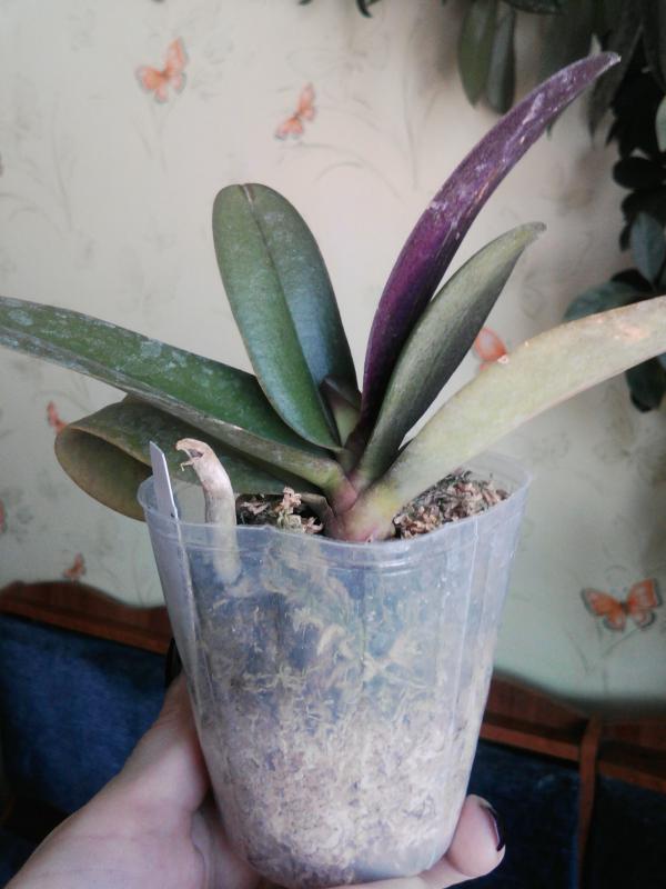 Крепкое растение, с отличными корнями, один лист сильно надорван у основания, цветонос также надломлен. Один средний лист деформирован. Живности не обнаружено)