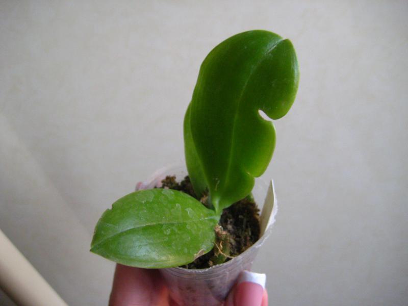 Растение бодренькое, тургор отличный, всего 4 листа, один лист сломан продольно (на фото он самый нижний под молодым листом) до середины листа сбоку от центральной жилки. Корневая система хорошая, правда 7 корней обломаны в 2-3 см от шейки, причем 4 - давно, а 3 - недавно при упаковке - корни там же рядом во мху (жалко - хорошие ветвящиеся здоровые корешки были). Корни по длине - высота горшка + половина окружности дна горшка, т.е. не длинные, но густые. В целом не создает впечатления готового к цветению растения, хотя глубоко во мху от ствола торчал догнивающий пенек сантиметр длиной похожий на обрубок цветоноса. Вредителей и болячек не обнаружил.