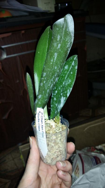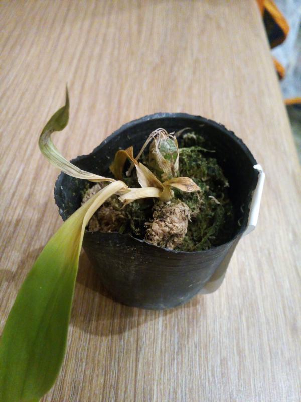 6. Rhyncholaeliocattleya Hwa Yuan Grace 'Cat King' Приехала с огромной улиткой, которая погрызла в дороге всю газету и следы жизнедеятельности улитки по всей каттлее))) 9 бульб, две из них гнилые (коричнивые, мягкие, мокрые), живые корни обнаружила уже у крайних 4-5 бульб, но и они не блещут здоровьем. Растение держиться добрячком. Листья и бульбы в грибке, механических повреждениях. Похоже, что цвело единожды. Не могу сказать, что расстроена, но и радоваться здесь нечему.