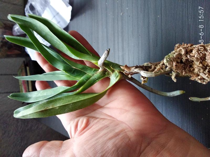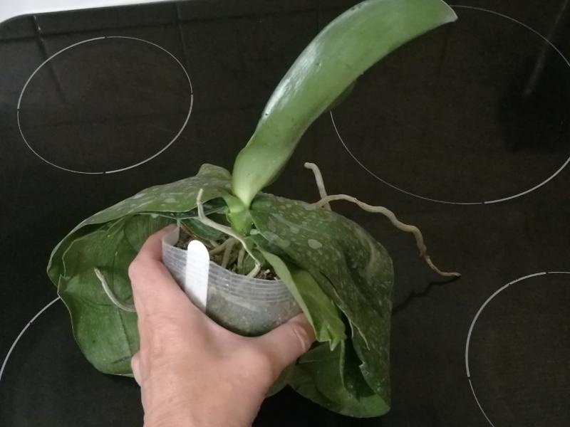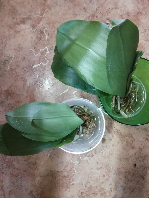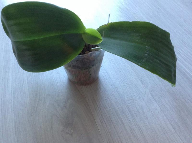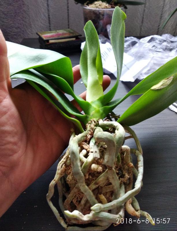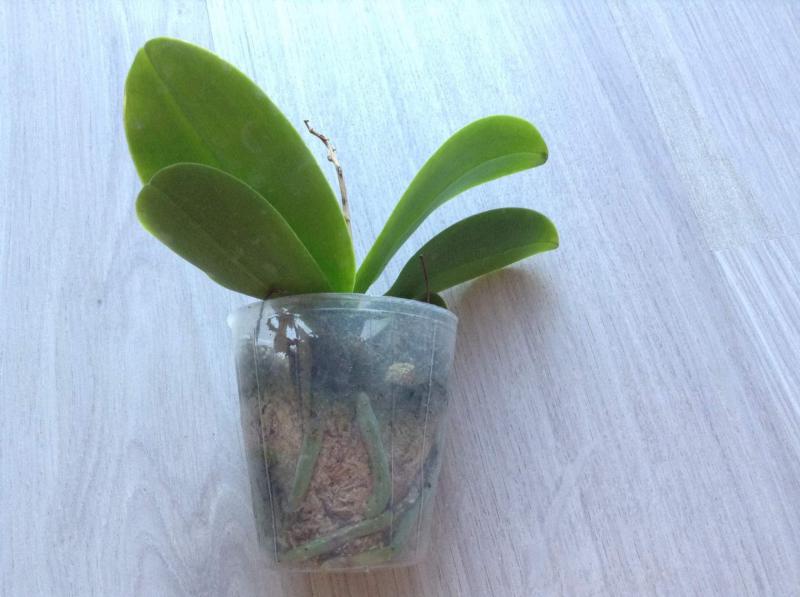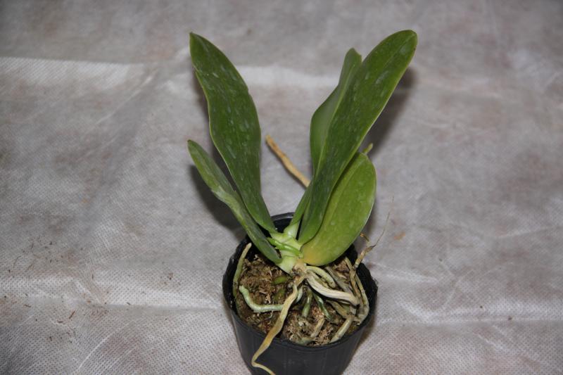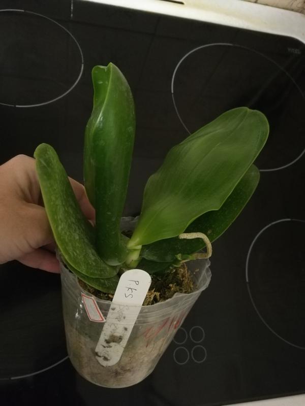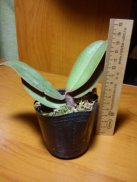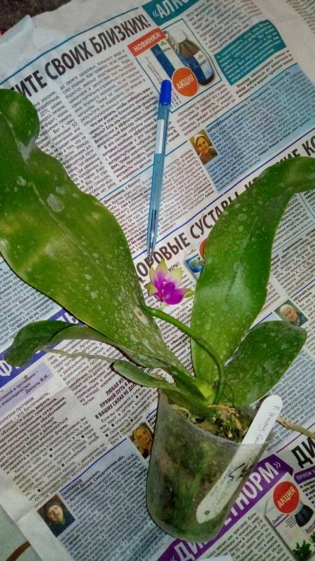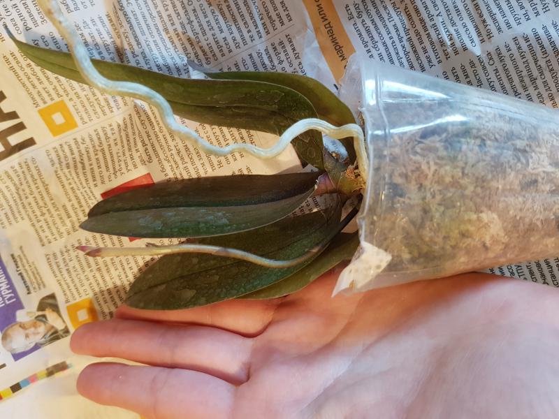 Орхидея в сухом мхе, горшок 2,5, три листа в нормальном тургоре, самый большой из которых 6 см, проклевывается новый лист, развитая корневая, не цвела, видимых вредителей нет, но в субстрате болтался панцирь улитки.