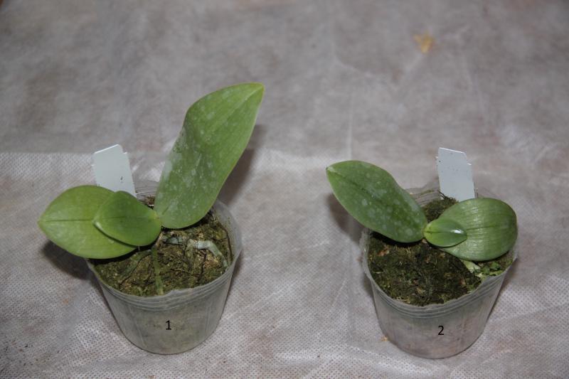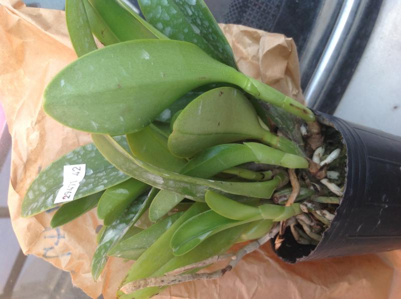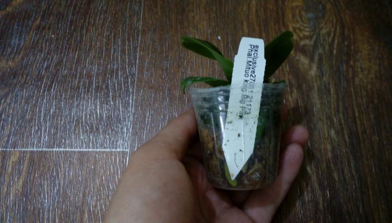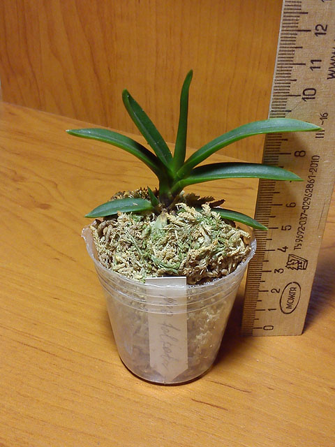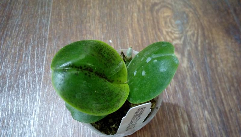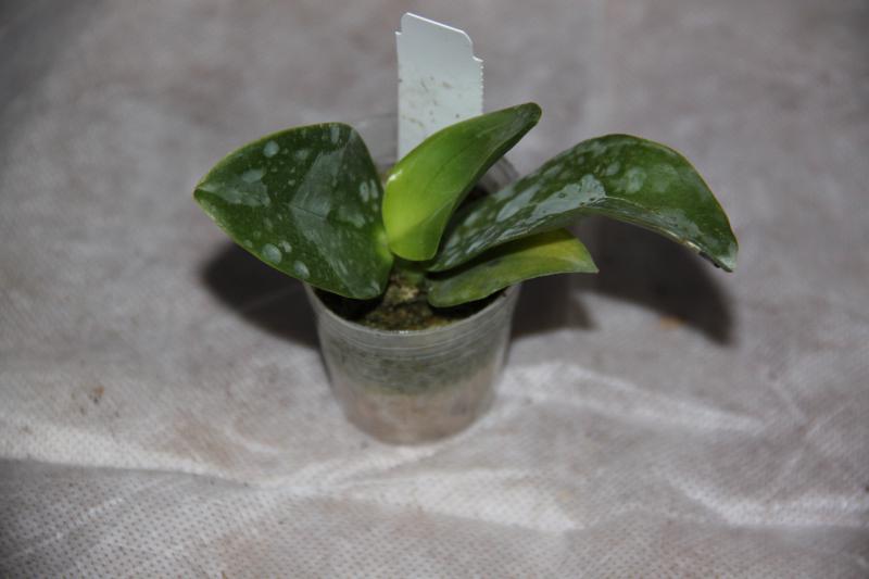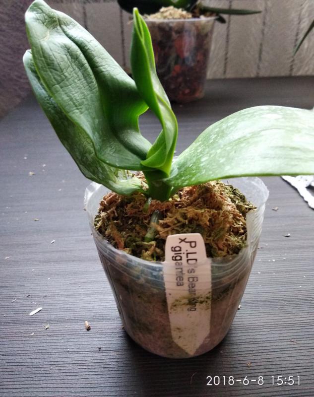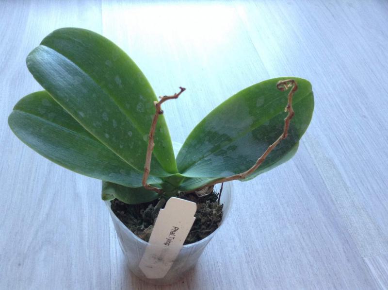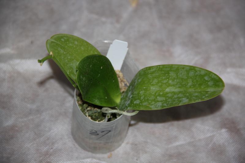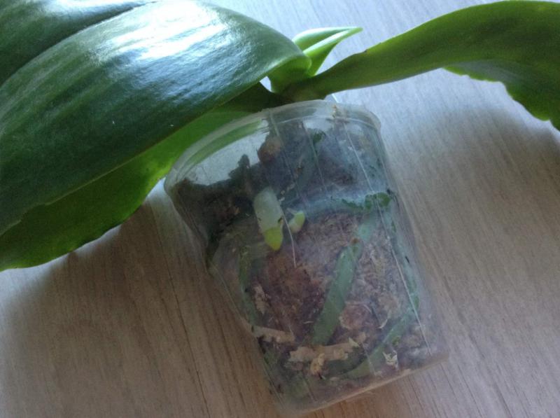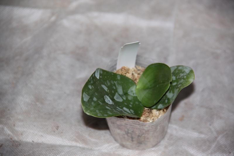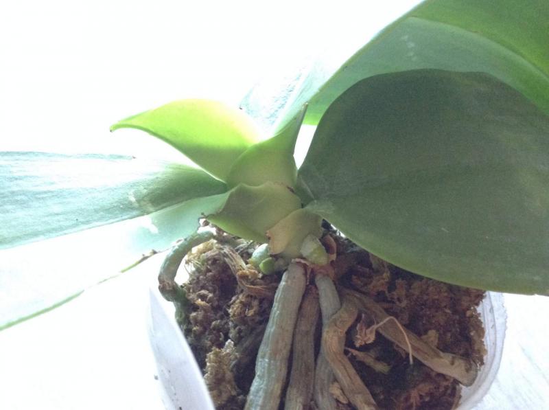 Орхидея в сухом мхе, горшок 2,5, три листа в нормальном тургоре, самый большой из которых 6 см, проклевывается новый лист, развитая корневая, не цвела, видимых вредителей нет, но в субстрате болтался панцирь улитки.