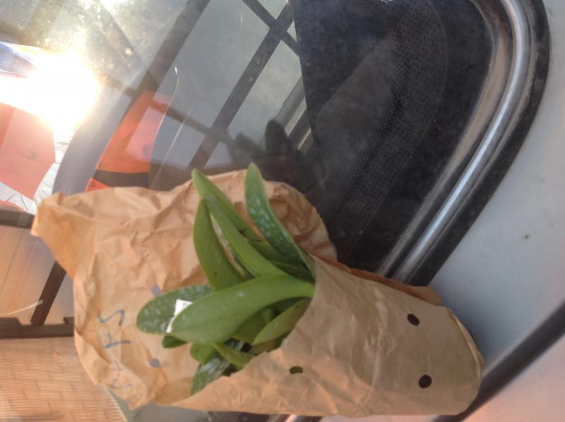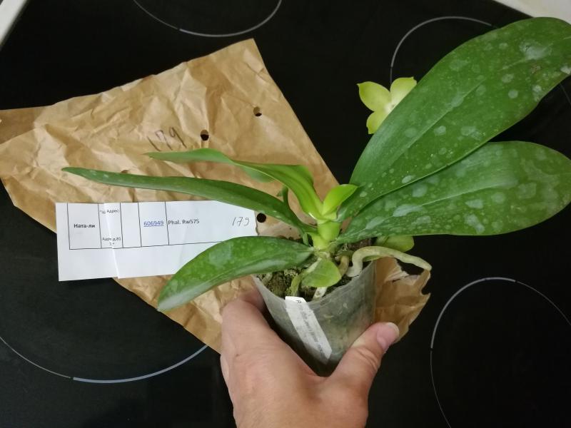 ОКС, подросток (обещали взрослый), десять листьев со сниженным тургором, самый большой из которых 16 см, один недоросший лист, один пожелтевший, на листьях грибок (черные точки), живых корней нет, только сгнившие и засушенные, не цвело.