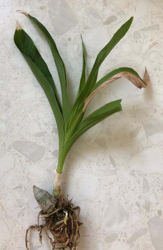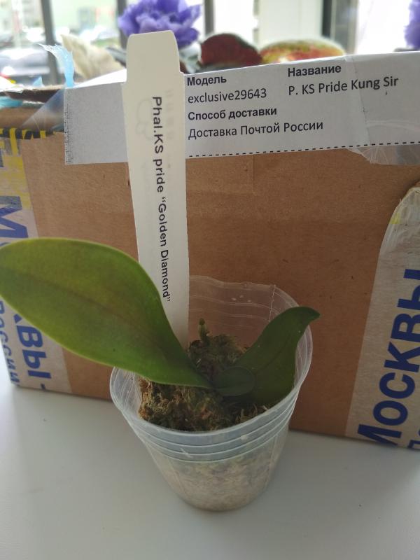 От Джоя. Не очень я довольна. Ну вы сами видите что с корнями, правда не смертельно. Размер хороший, ботва тоже. Есть пенек от цветоноса. Один лист утерян при пересылке, кусочек сухой остался. Итого 3 листа, несколько верхних корней и непонятное пятно на шее с чернотой под оной. Пересылка была без мха.